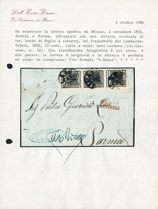 1850 - Lombardy Venetia, 1st issue, 10c coal black ST3, left sheet margin, 7 mm, from 'MILANO 2/11' (56) to Parma. Cert. E.Diena (Sassone 2e – Euro 6,000+)