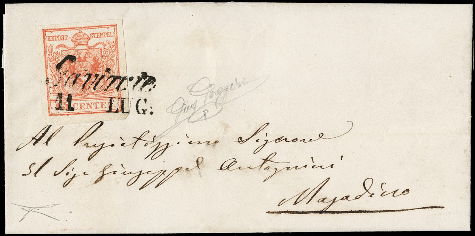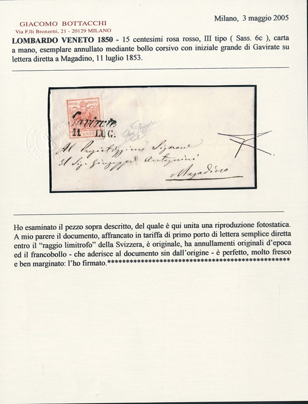 1850 - Lombardy Venetia, 1st issue,15c pink red 3rd type hand paper, from 'GAVIRATE 11 LUG.' (53) to Magadino, proximity rate to Switzerland. Sign. Gaggero, Cert. Bottacchi (Sassone 6c - Euro -)