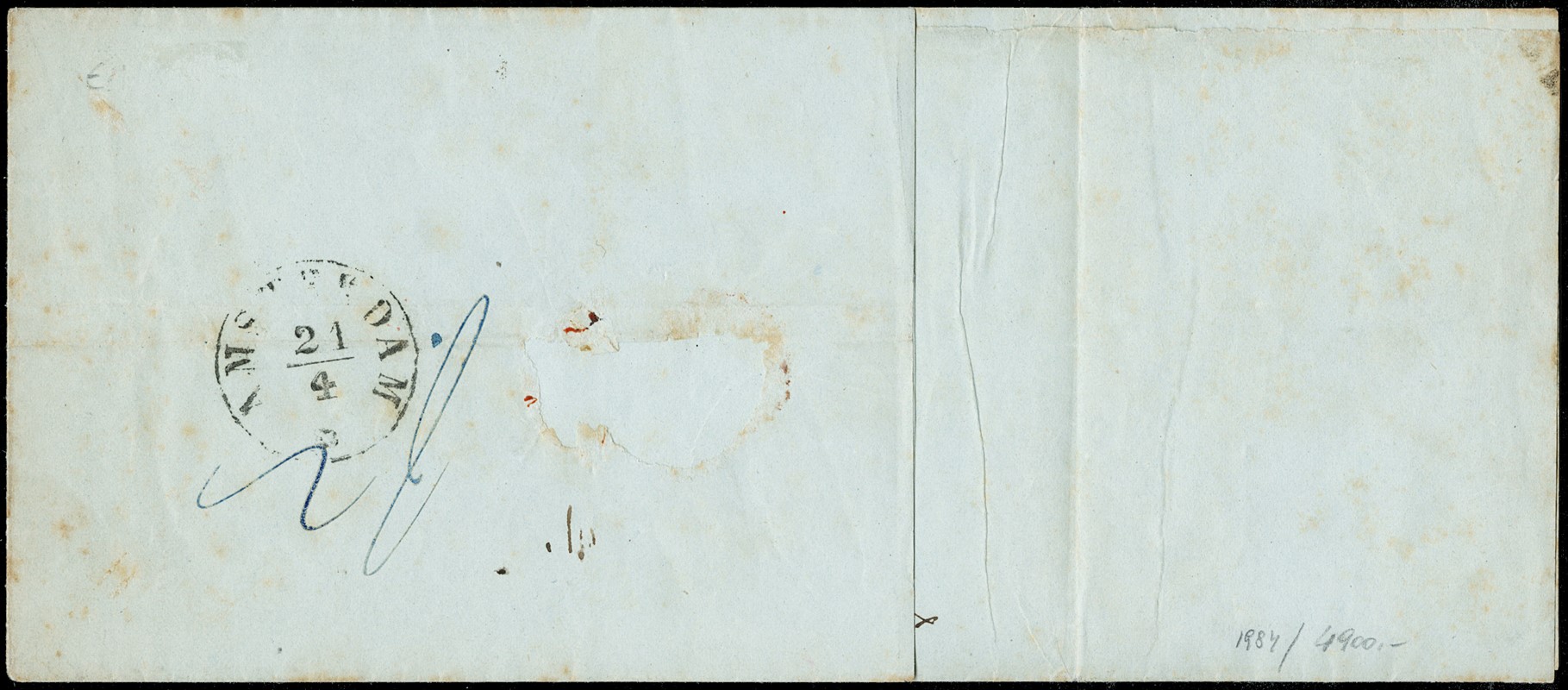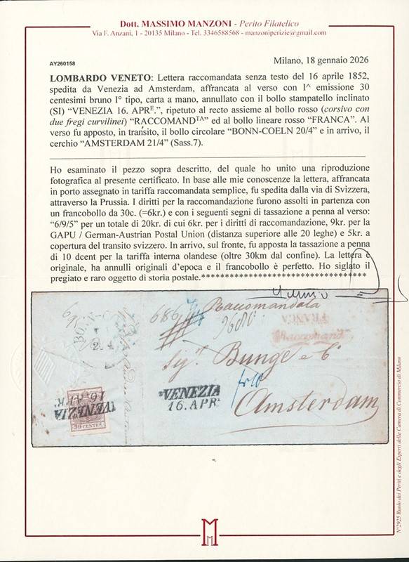 1850 - Lombardy Venetia, 1st issue, 30c brown, type I, on reverse of registered cover (manuscript) from 'VENEZIA 16 APR' (1852) to Amsterdam. Rare cover to the Netherlands with postage paid in cash and franked only for the fixed registration fee. Cert. Manzoni (Sassone 7 – Euro –)
