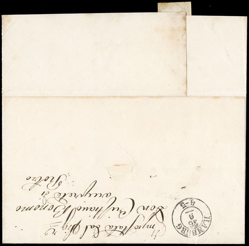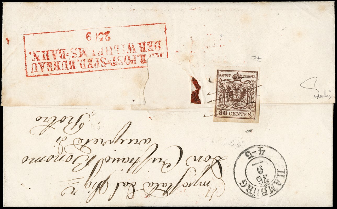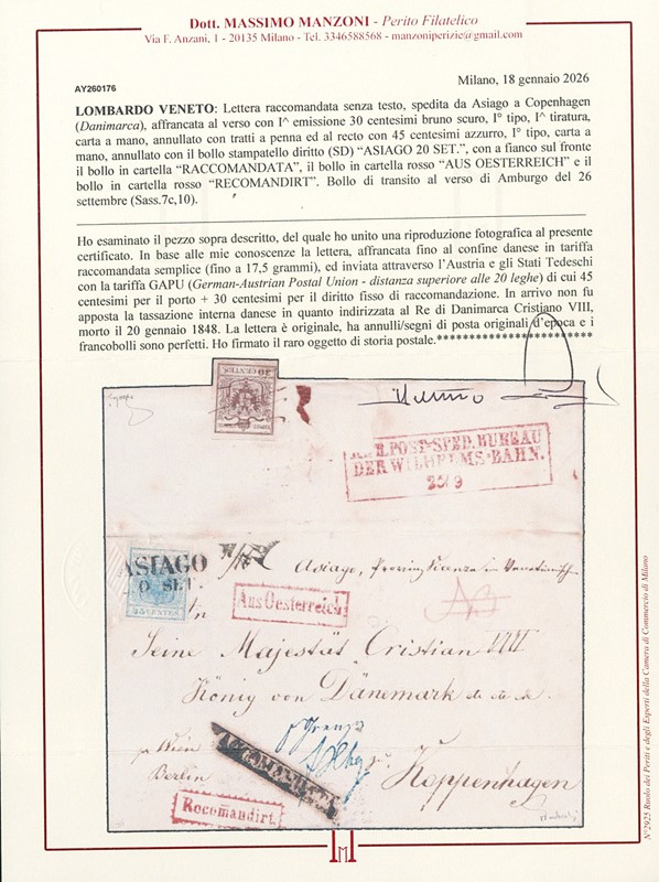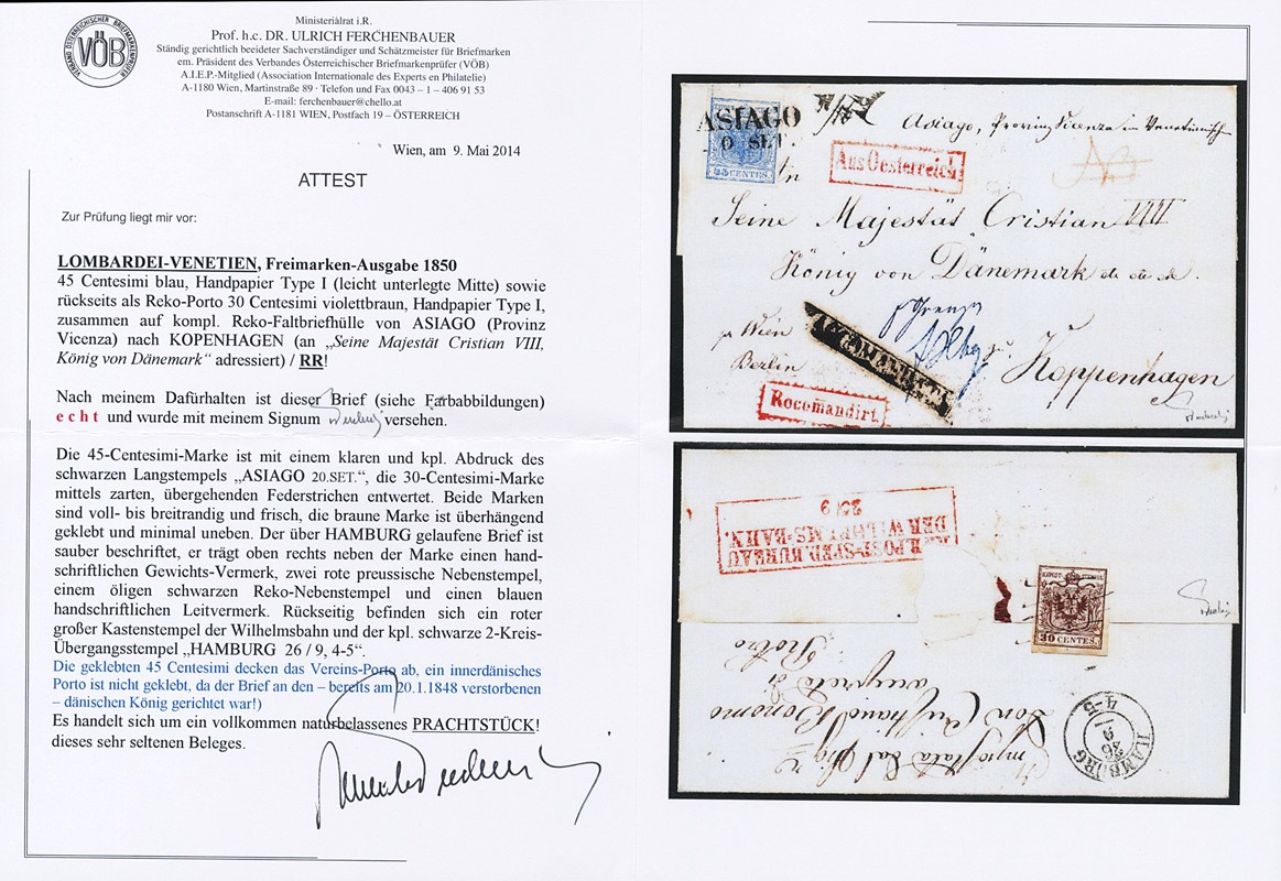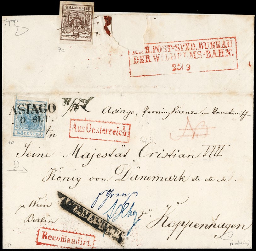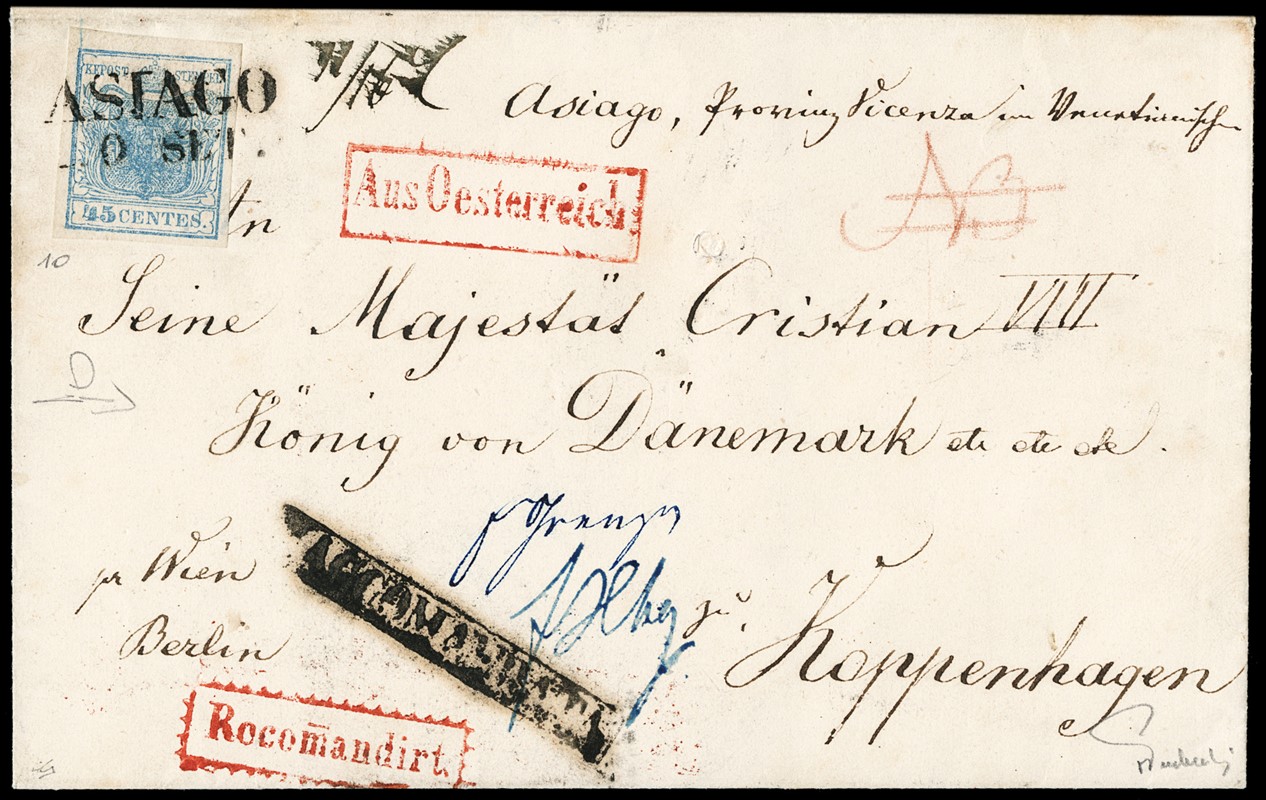 1850 - Lombardy Venetia, 1st issue, 45c blue, type I, hand paper and 30c brown lilac, type II, handmade paper, pen-cancelled on reverse of registered cover from 'ASIAGO 20 SEP' to Copenhagen. Extremely rare postal history item both for the destination and as addressed to H.R.H. Christian VIII of Denmark. Certs. Ferchenbauer and Manzoni (Sassone 9+10 – Euro –)
