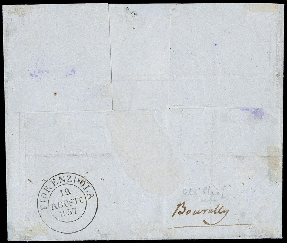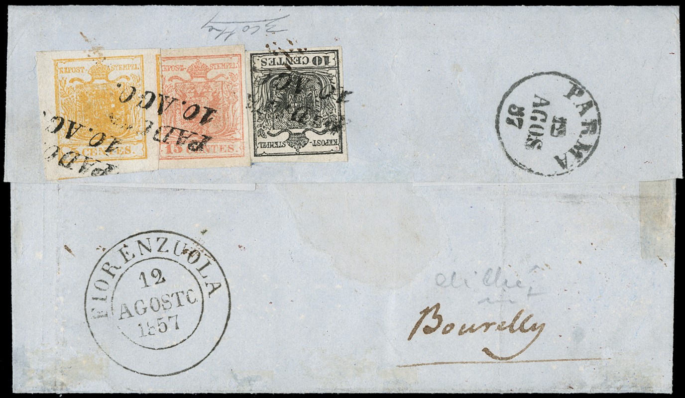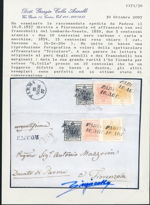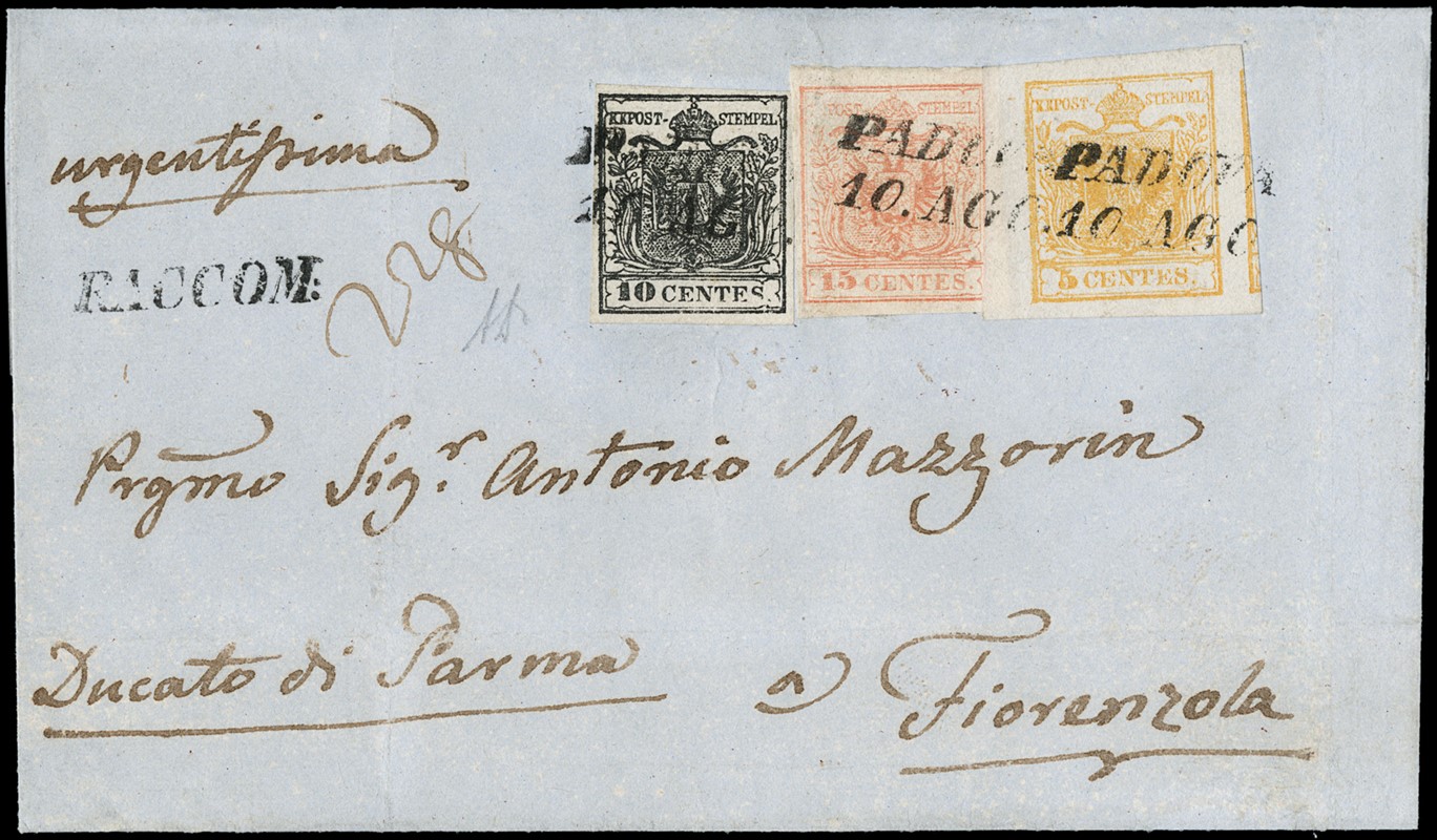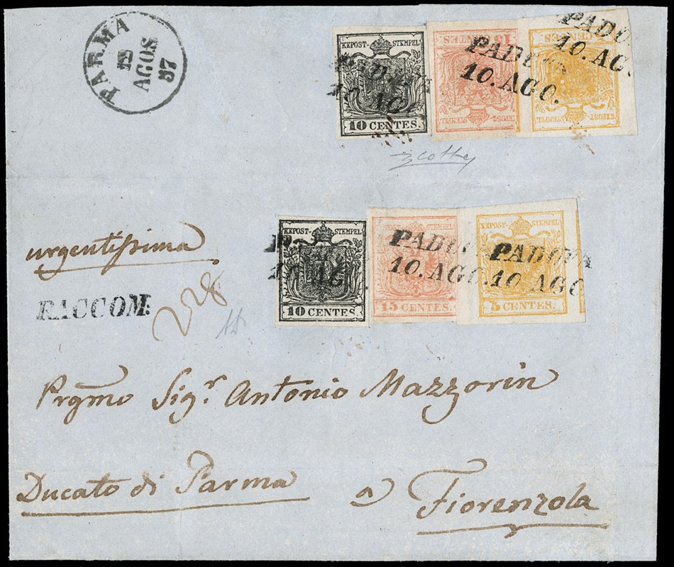 1850 - Lombardy Venetia, 1st issue, 5c orange, handmade paper, two copies; 10c coal black, hand paper, two copies; and 15c light rose, type III, machine paper, two copies, forming a double tricolour franking (one on front and one on reverse) on registered cover from 'PADOVA 10 AGO' to Fiorenzuola (Duchy of Parma). Side repair and part of letter at right added, nevertheless splendid and spectacular franking of great rarity. Signed A.Diena, cert. Colla (1h+2e+20e - Euro -)