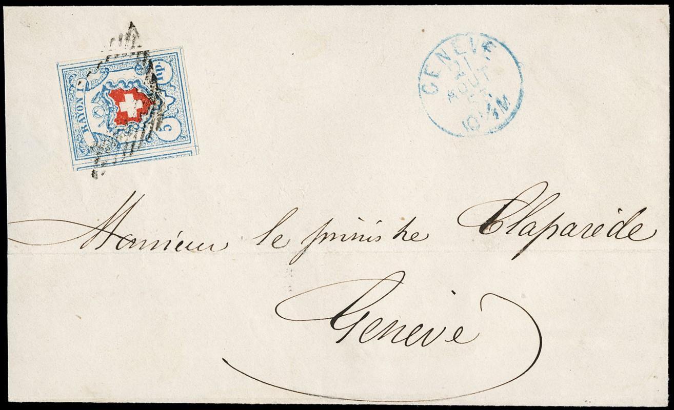 1850 - Federal Post, Rayon I, blue and red 5rp, from 'GENEVE 21 AOUT 53' for Geneve. Superb (Zumstein 17II - CHF 400)