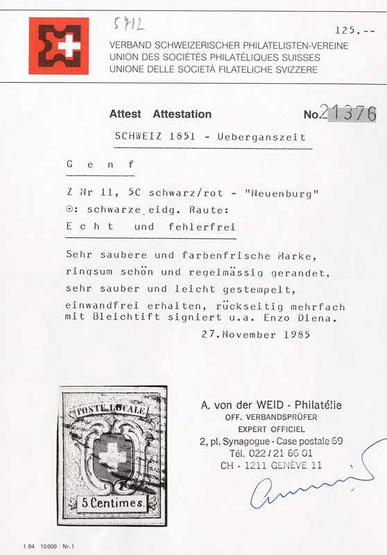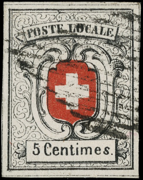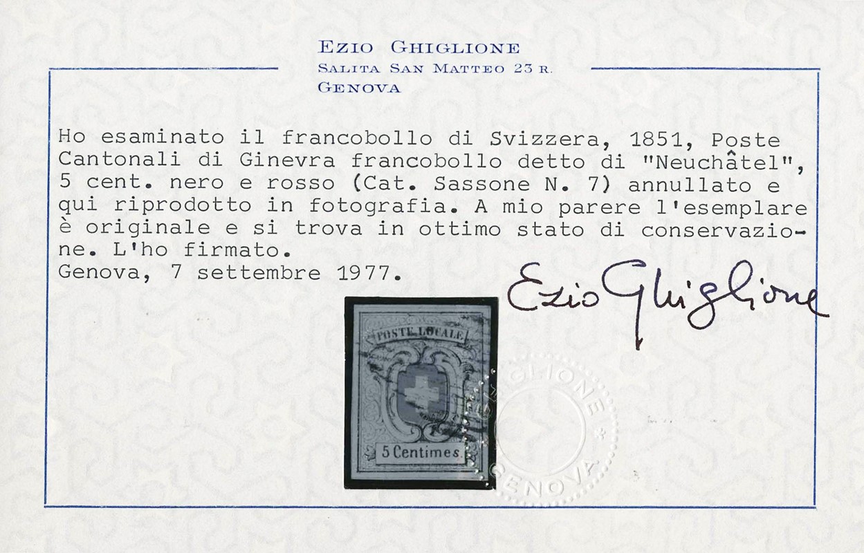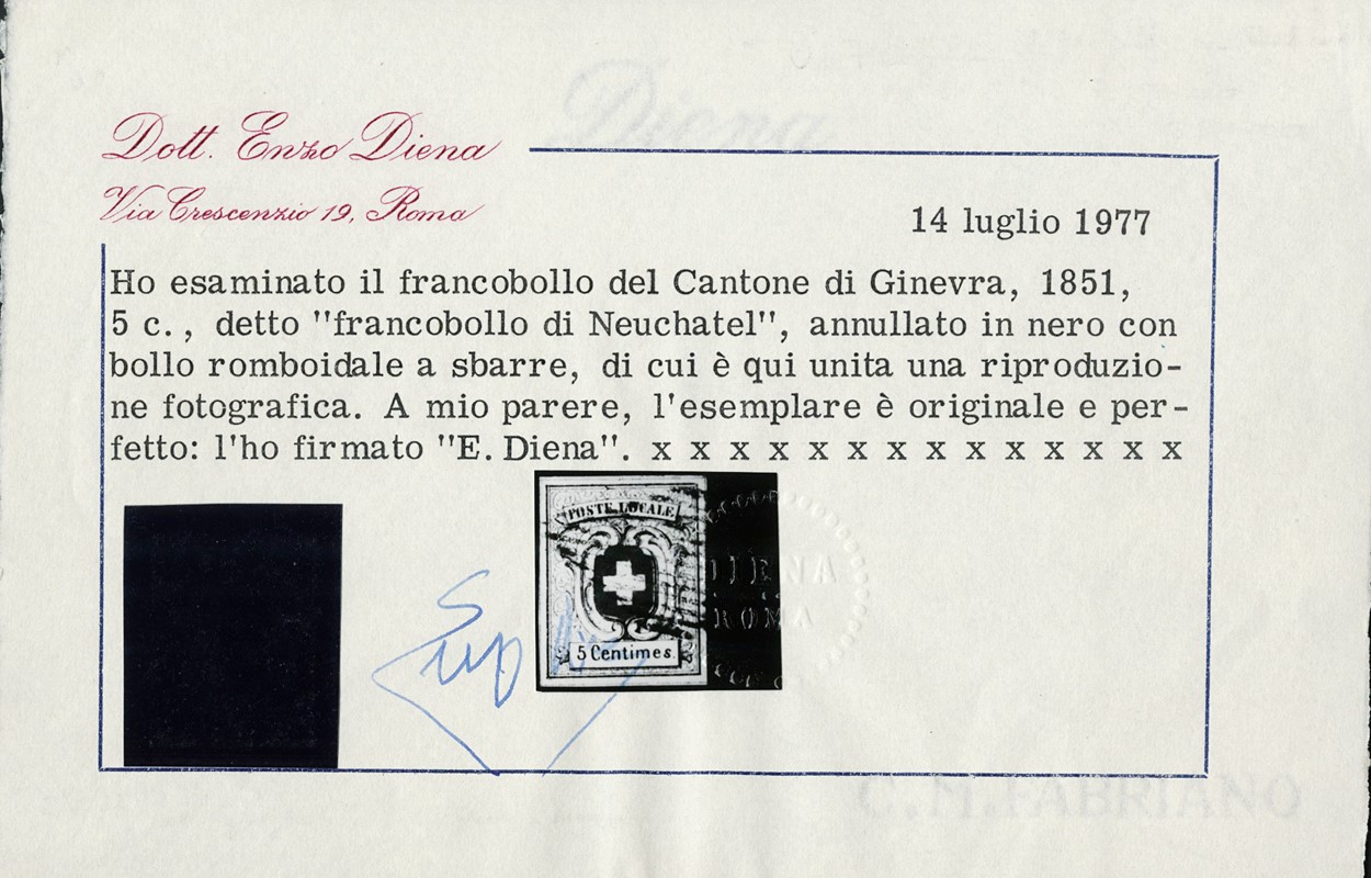 1851 - Switzerland - Geneva: Black 5c, 'Neuchatel'. certs. E.Diena, Ghiglione and Von der Weid (Zumstein 11 - CHF 4.800)
