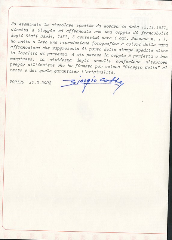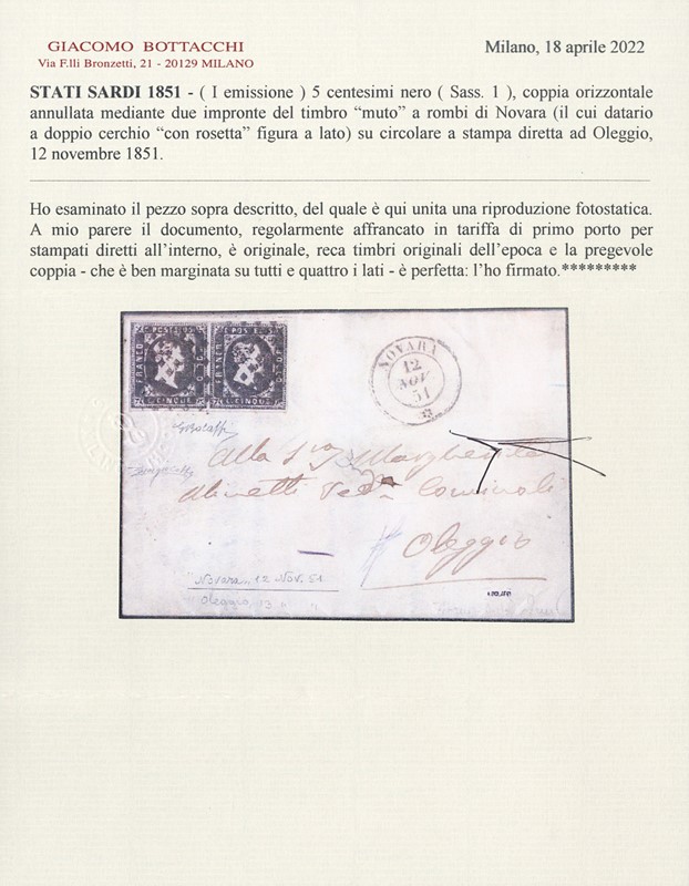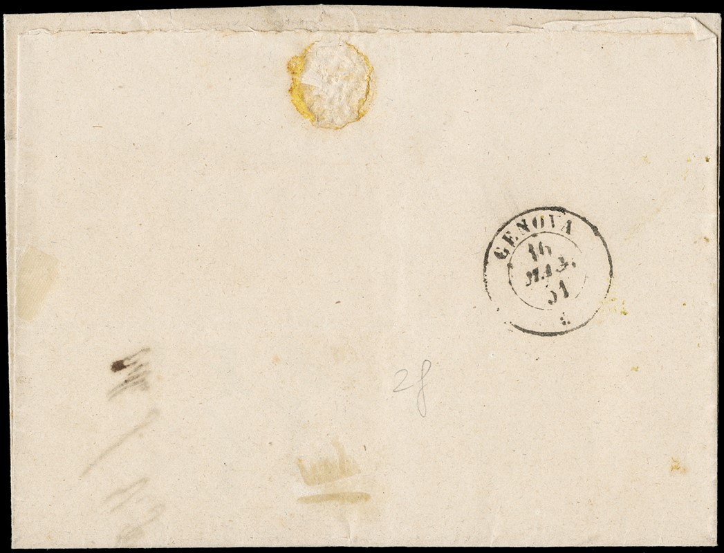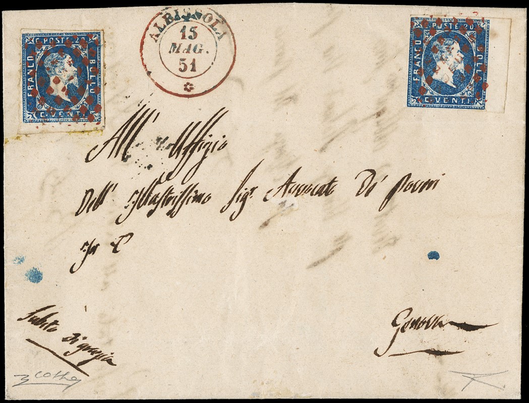 1851 - 1st issue, 20c light blue I printing, two sheet border copies cancelled with lozenge handstamp from 'ALBISSOLA 15 MAY 51', both in red, to Genoa. Splendid. Colla and Bottacchi certs.(Sassone 2g+pt.10 - Euro 56.300+)