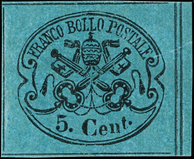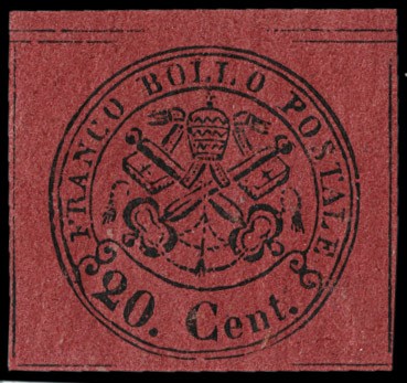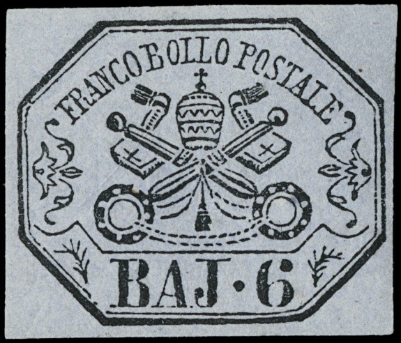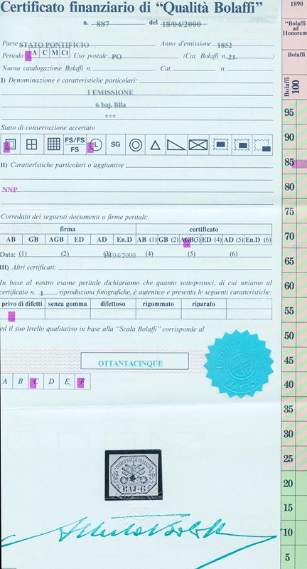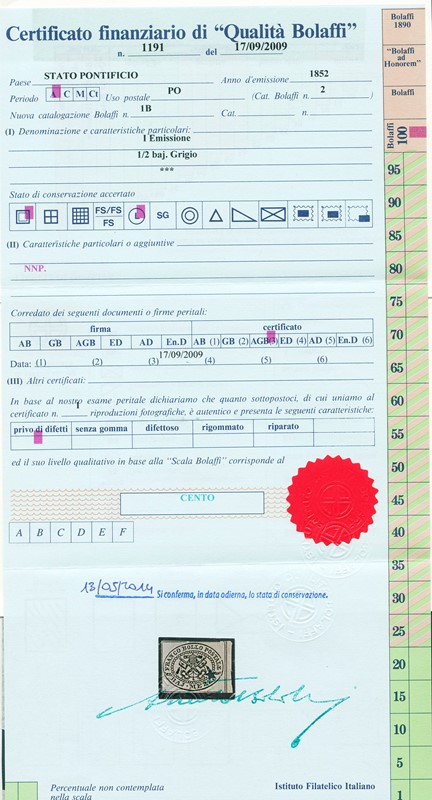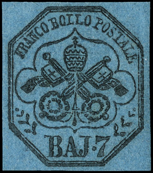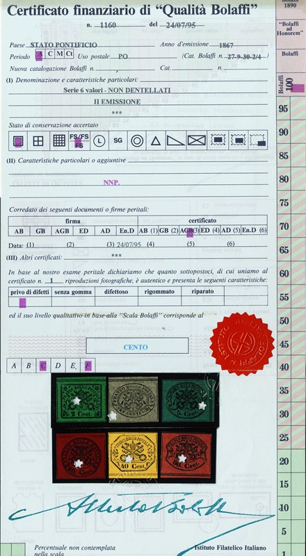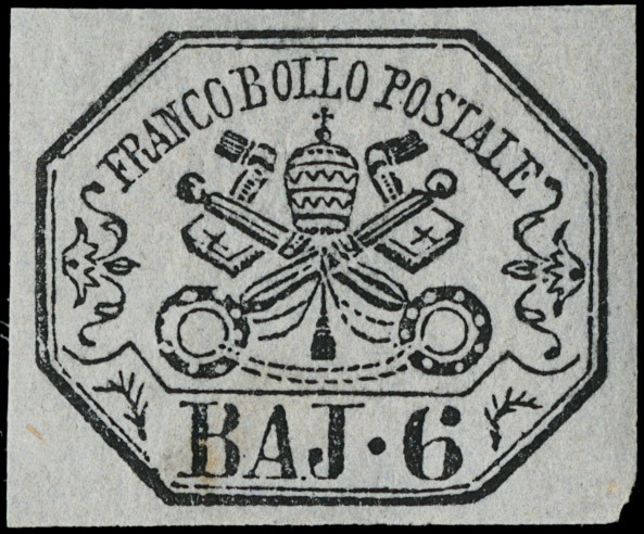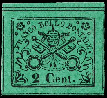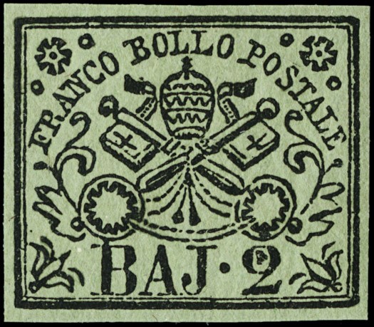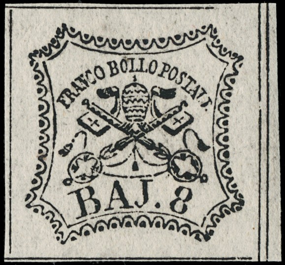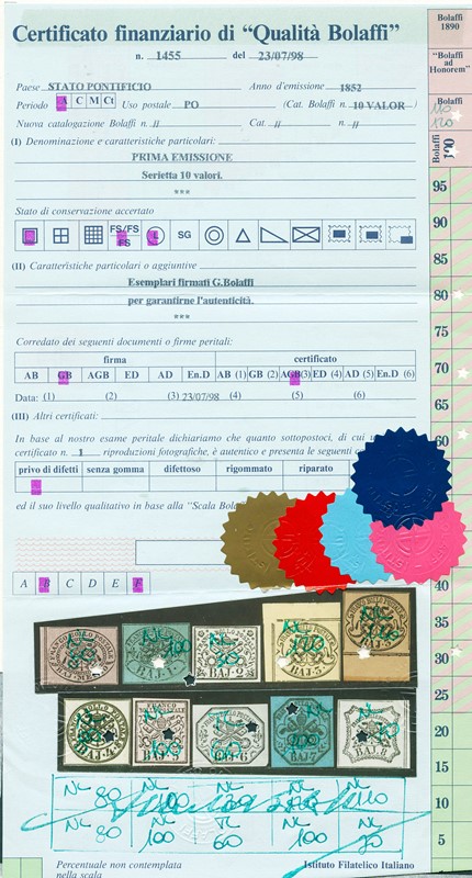 1852/67 - PAPAL STATES: group of 21 mint stamps (hinged and mint never hinged) from the 1st and 2nd issues, from 1/2 baj to 8 baj, plus values 2, 3, 5, 20, 40, 80c mounted on Bolaffi cards. Excellent condition in general, several with full sheet margins.