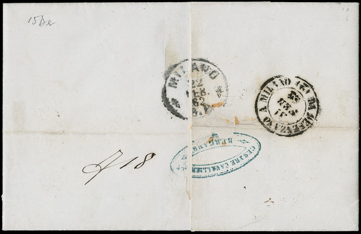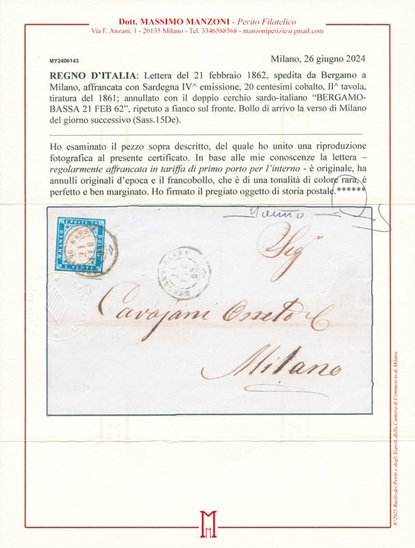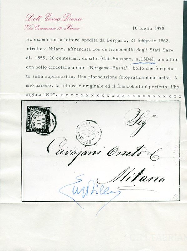 1855 - 20c cobalt, 2nd plate printing of '61, from 'BERGAMO BASSA 21 FEB 62' to Milano. Cert. E.Diena and Manzoni (Sassone 15De - Euro 18.000)
