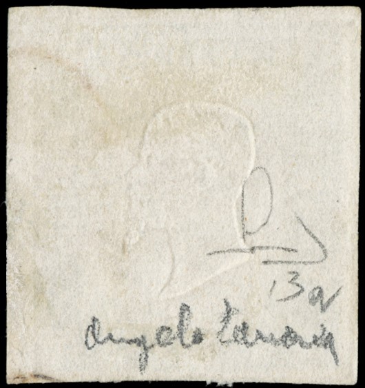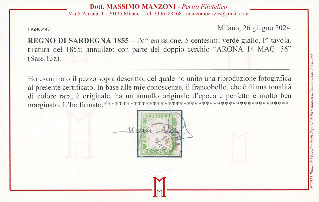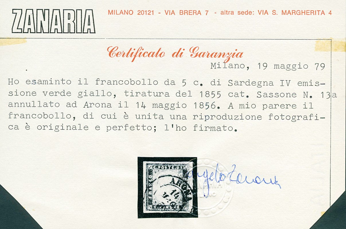 1855 - 5c green yellow, 1st plate printing of '55, canceled 'ARONA 14 MAG. 56'. Very rare. Cert. Zanaria and Manzoni (Sassone 13a - Euro 12.000+)