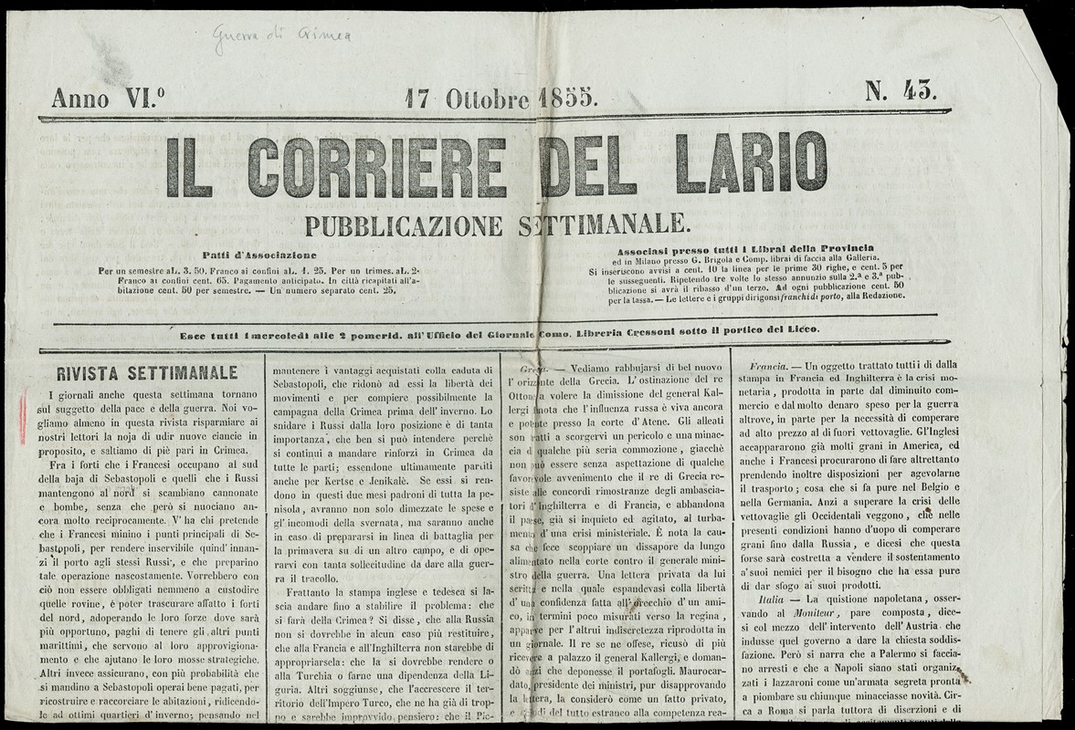 1855 – Newspaper 'Il Corriere del Lario', dated 17 October 1855, containing news concerning the Crimean War. An interesting historical document in very fine condition