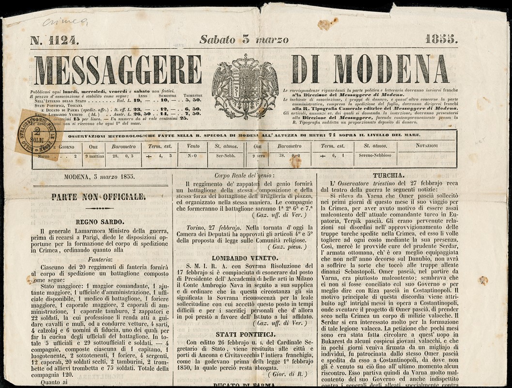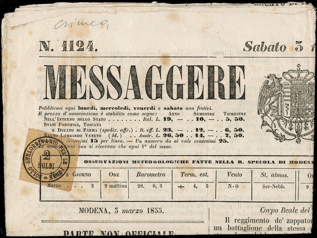 1855 - Newspaper 'Messaggere di Modena', dated 3 March 1855, including reports concerning the Crimean War, bearing a 2 soldi Tuscan postage due stamp.An interesting historical document in very fine condition (Sassone SG1 - Euro -)