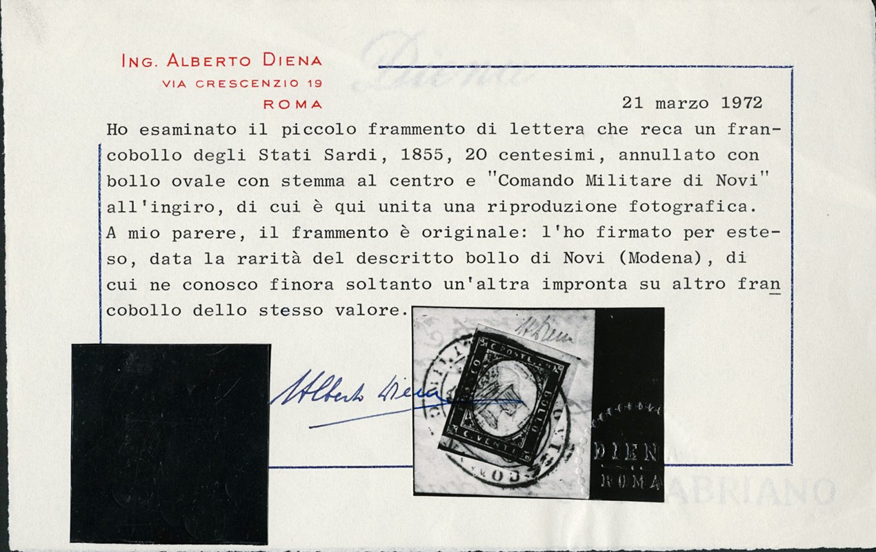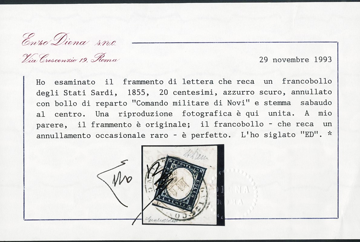 1855 - Second War of Independence: 20c blue, canceled 'COMANDO MILITARE DI NOVI' (oval with Savoy cross in the center). Extremely rare strike on a perfect stamp. The finest of the two recorded. Signed G. Bolaffi, certs. A. and E.Diena (Sassone 15+pt.R3 - Euro 7,500++)