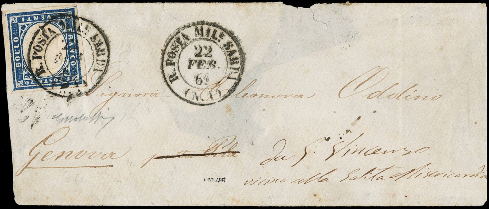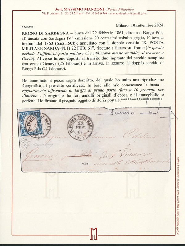 1855 - 20c greyish sky-blue, cancelled 'R. POSTA MILITARE SARDA (N.1) 22 FEB. 61', sent by a soldier from Gaeta to Genoa. Very interesting and uncommon; it anticipates by four months the earliest date recorded in the Sassone catalogue. Signed G. Bolaffi, cert. Manzoni (Sassone 15Ca+pt.12 - Euro 6,000+)