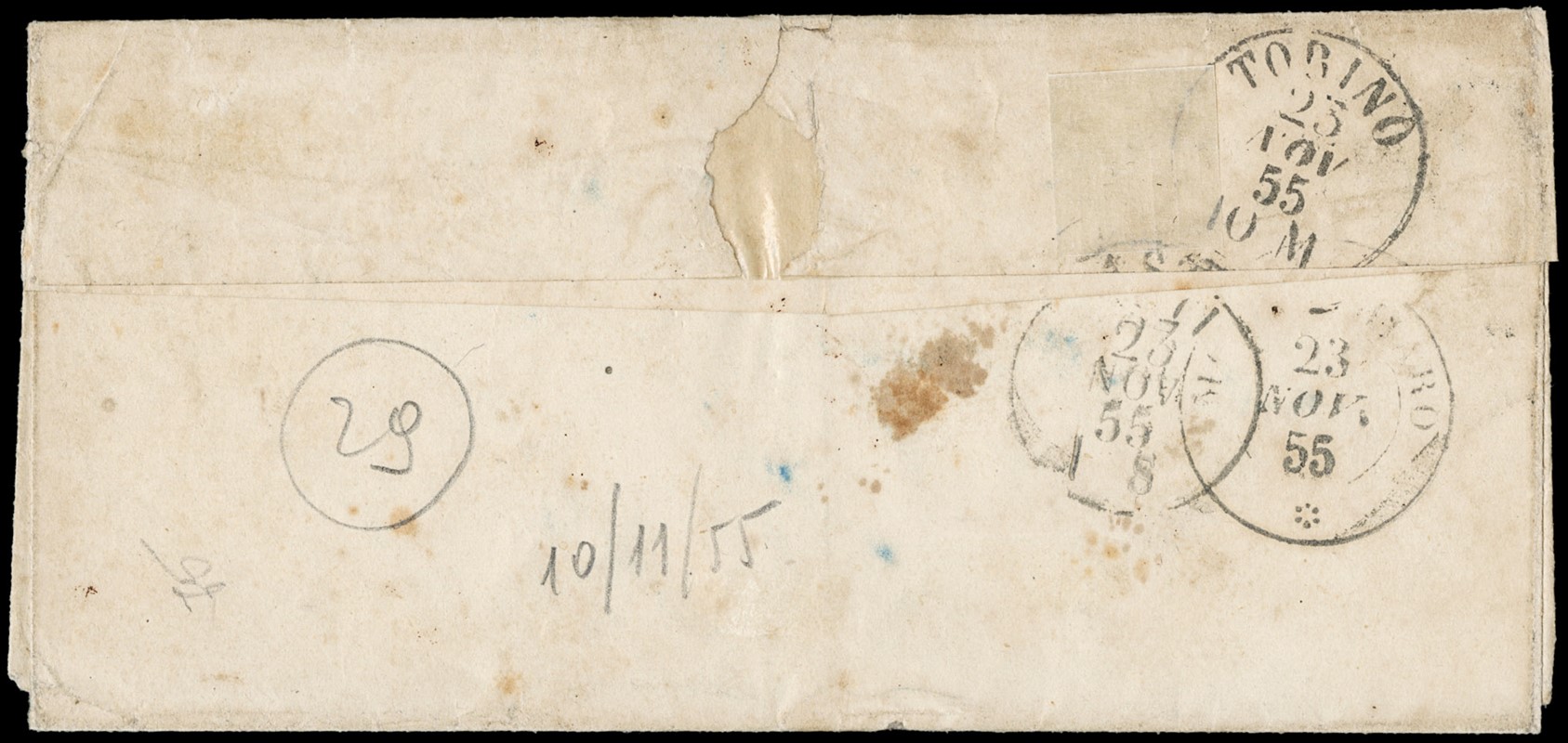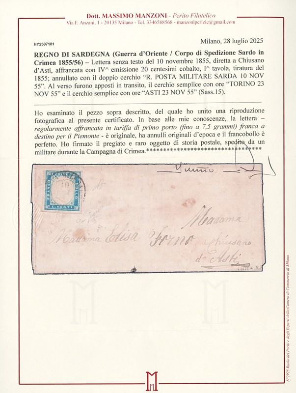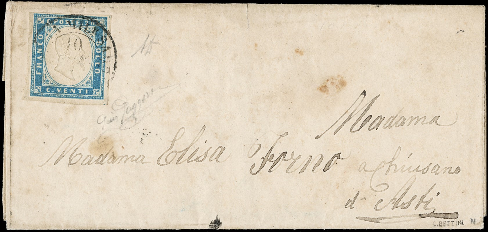 1855 - 4th issue, 20c cobalt cancelled 'R POSTA MIL.E SARDA 10 NOV 55' to Chiusano d’Asti. Signed A.Diena and Gaggero, cert. Manzoni (Sassone 15+12pt. - Euro 14,750)