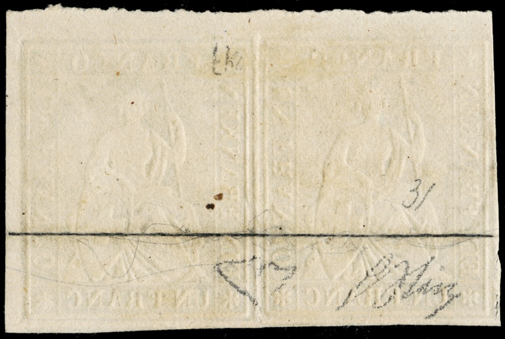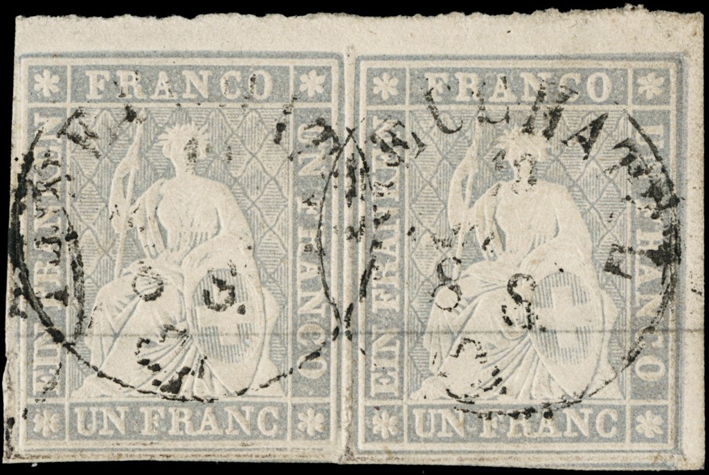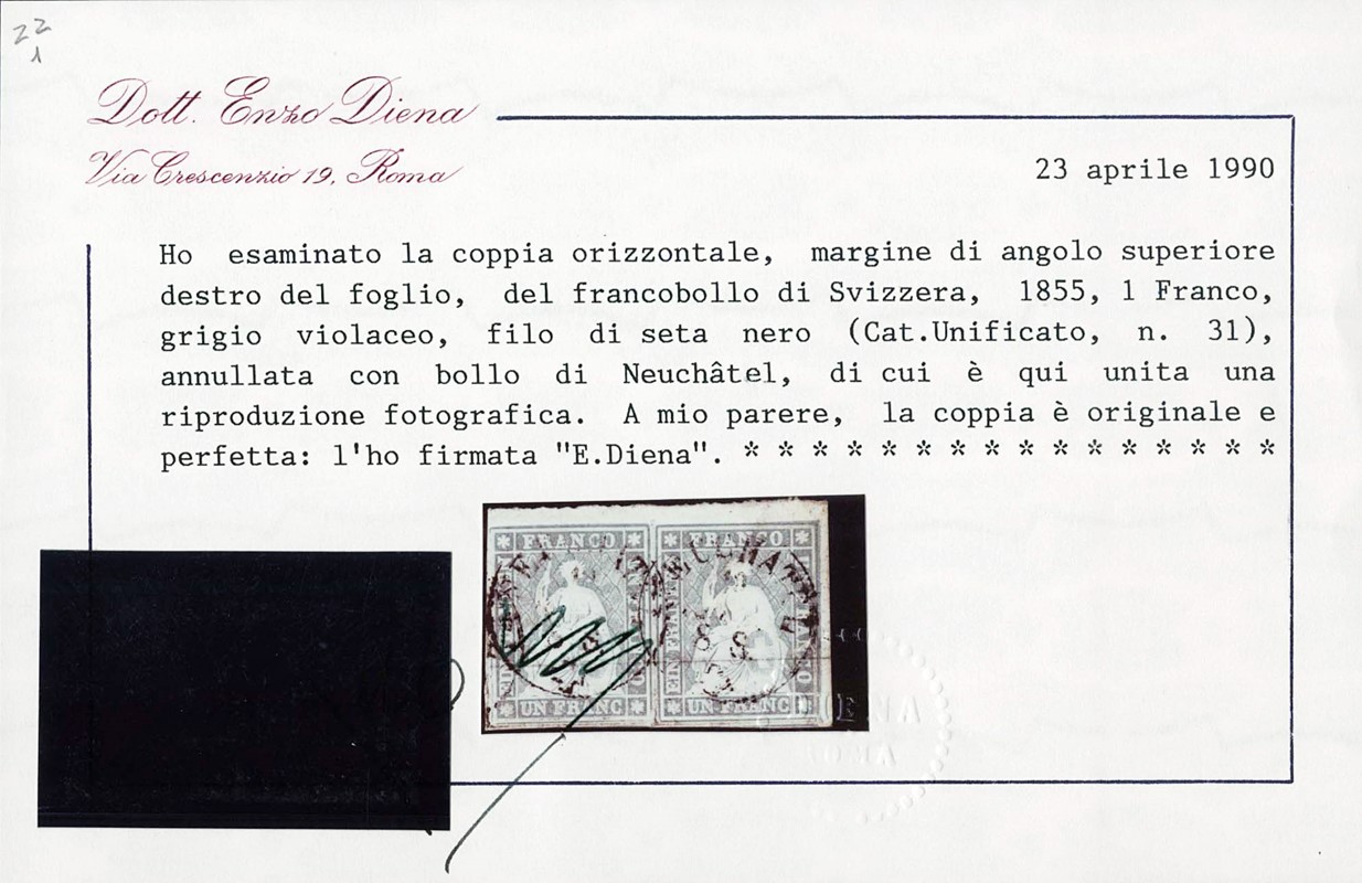 1855 - Strubel, purplish grey 1Fr, with black silk thread, top marginal pair with large margins used in 'NEUCHATEL'. Superb, signed G.Oliva, cert. E.Diena (Zumstein 31 - Euro 1.800++)