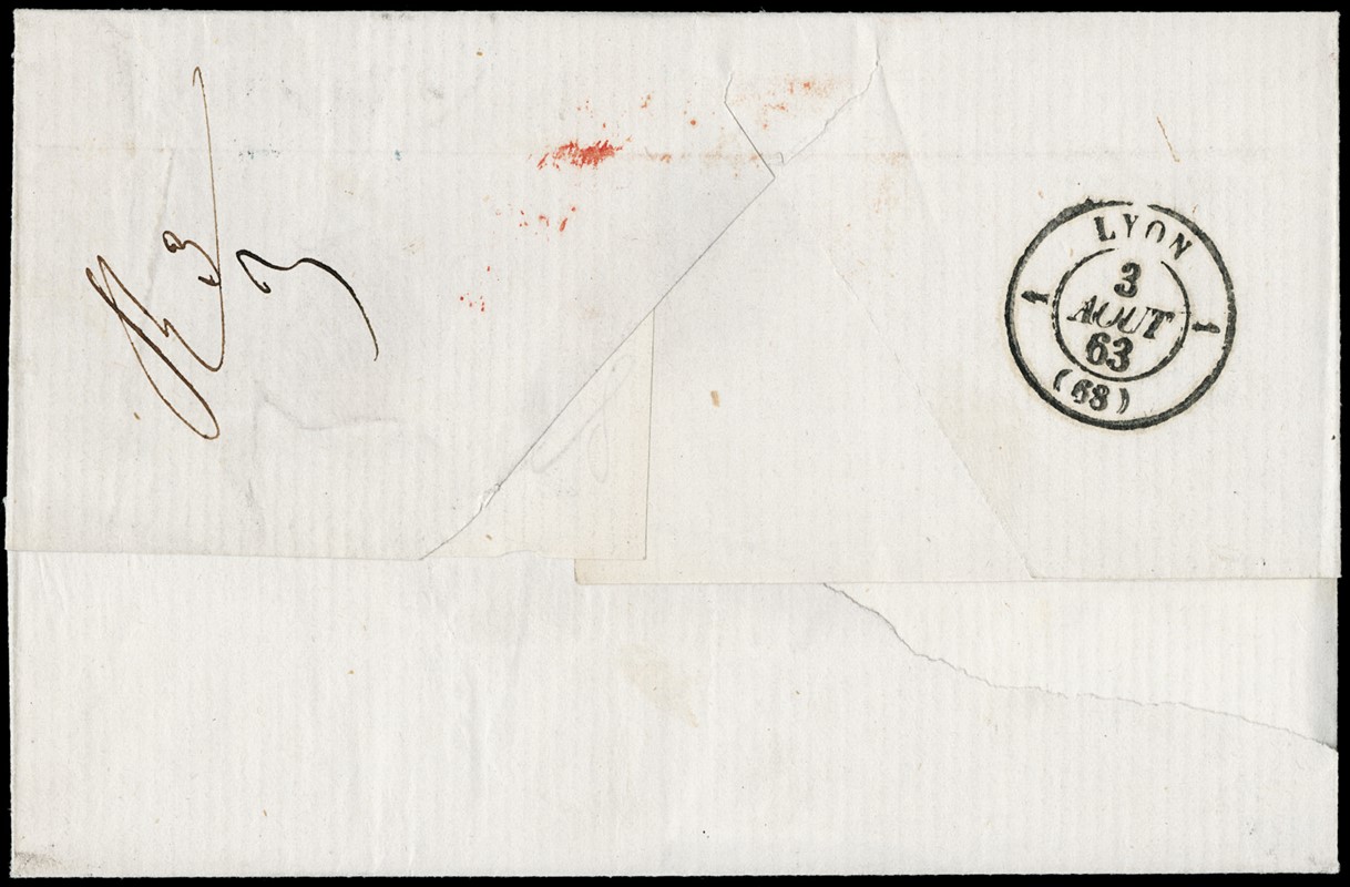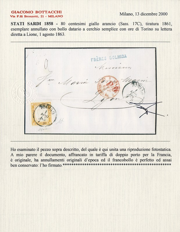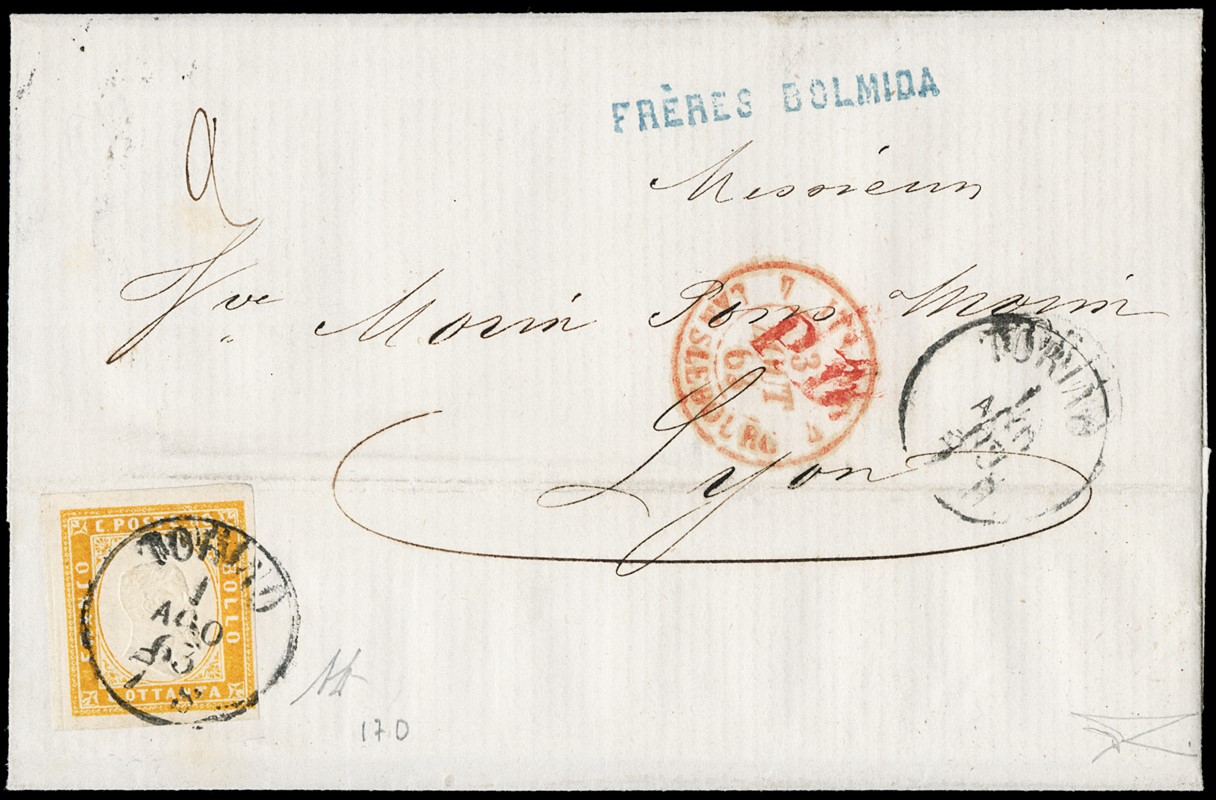 1858 - 80c yellow-orange, printing of 1861, from 'TORINO 1 AGO 63' to Lyon. Exceptionally fresh and superb. Signed A.Diena, Gazzi; cert. Bottacchi (Sassone 17C - Euro 4,250+)
