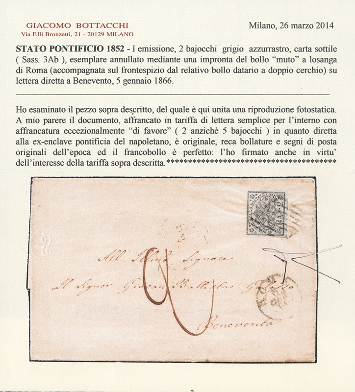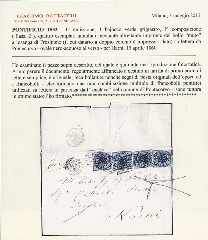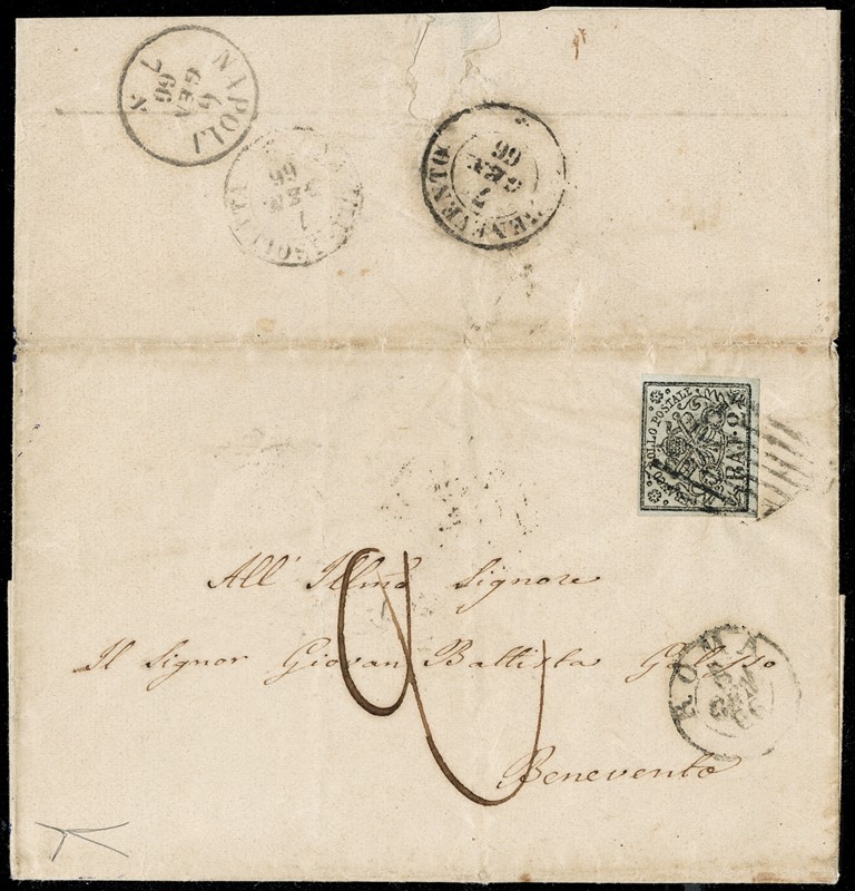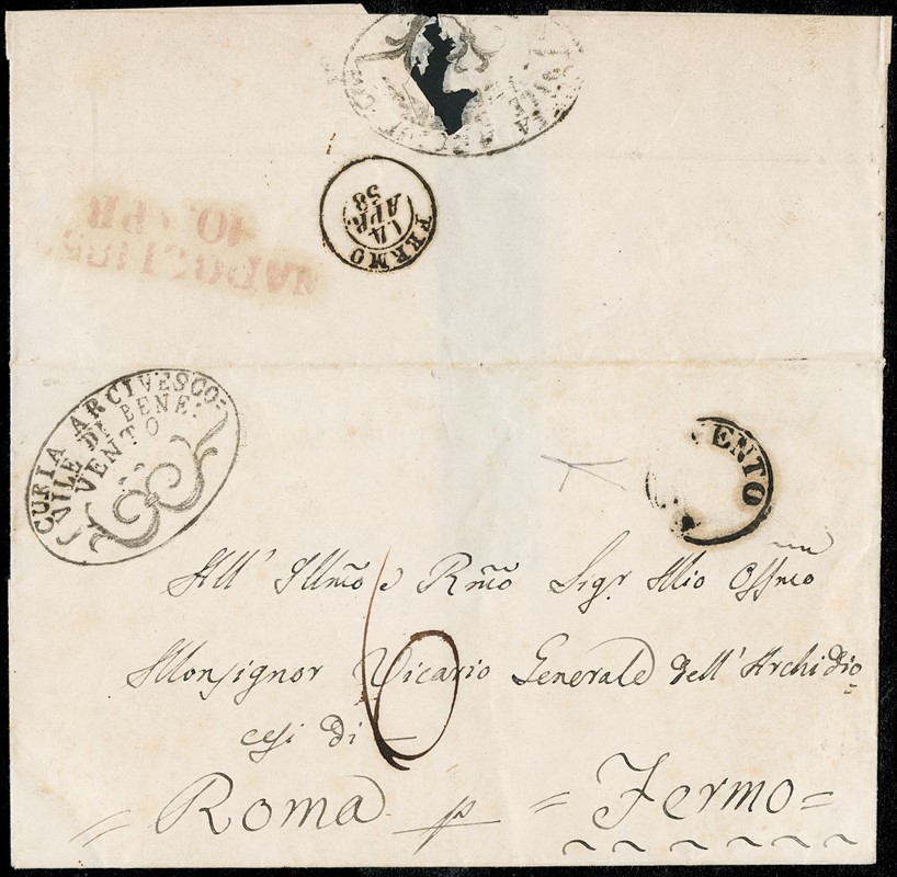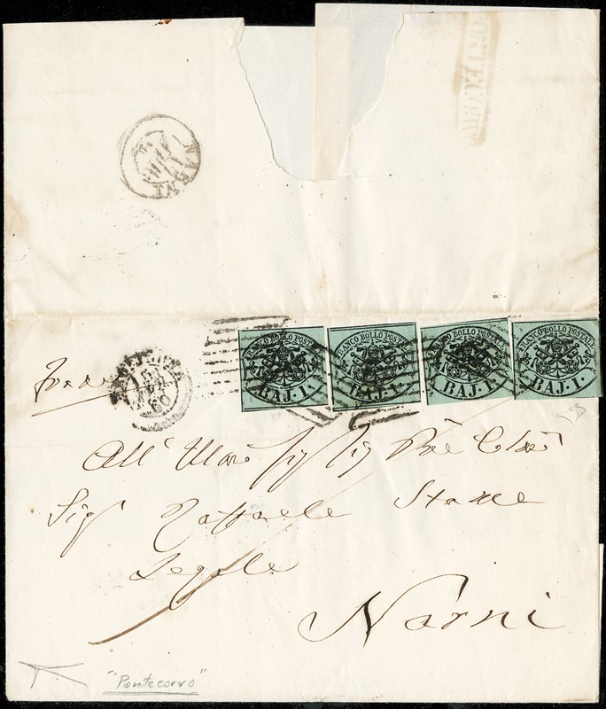 1858/66 – PAPAL ENCLAVES IN BOURBON TERRITORY: lot of three covers: one unpaid letter from Benevento with obliterated circular datestamp without date or year; one addressed to Benevento franked with 2 baj; and one from Pontecorvo to Narni franked with fou