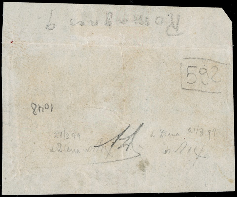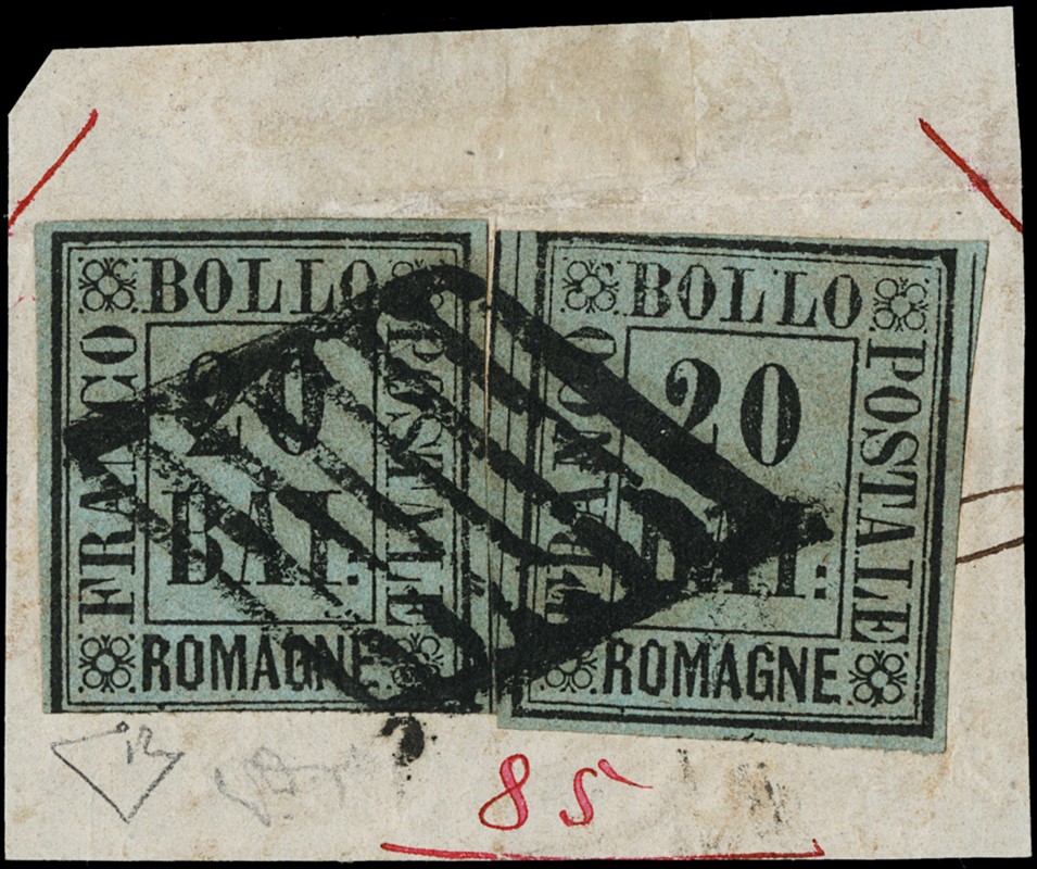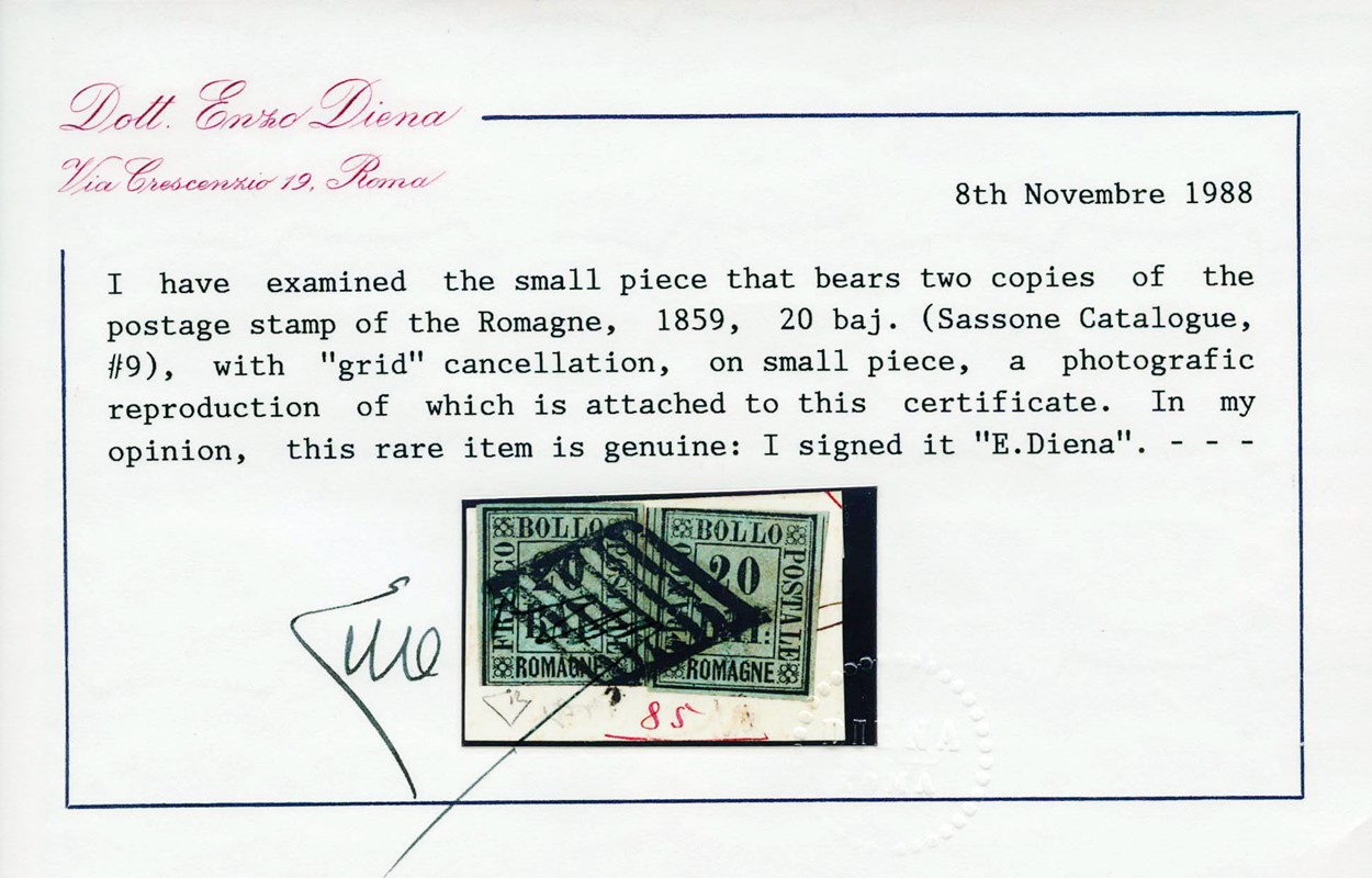 1859 - 20b grey blue, two copies cancelled with grid on piece. One stamp short at bottom, the other just touched at top left, together still rare and attractive. E.Diena cert. (Sassone 9 - Euro 12,000)