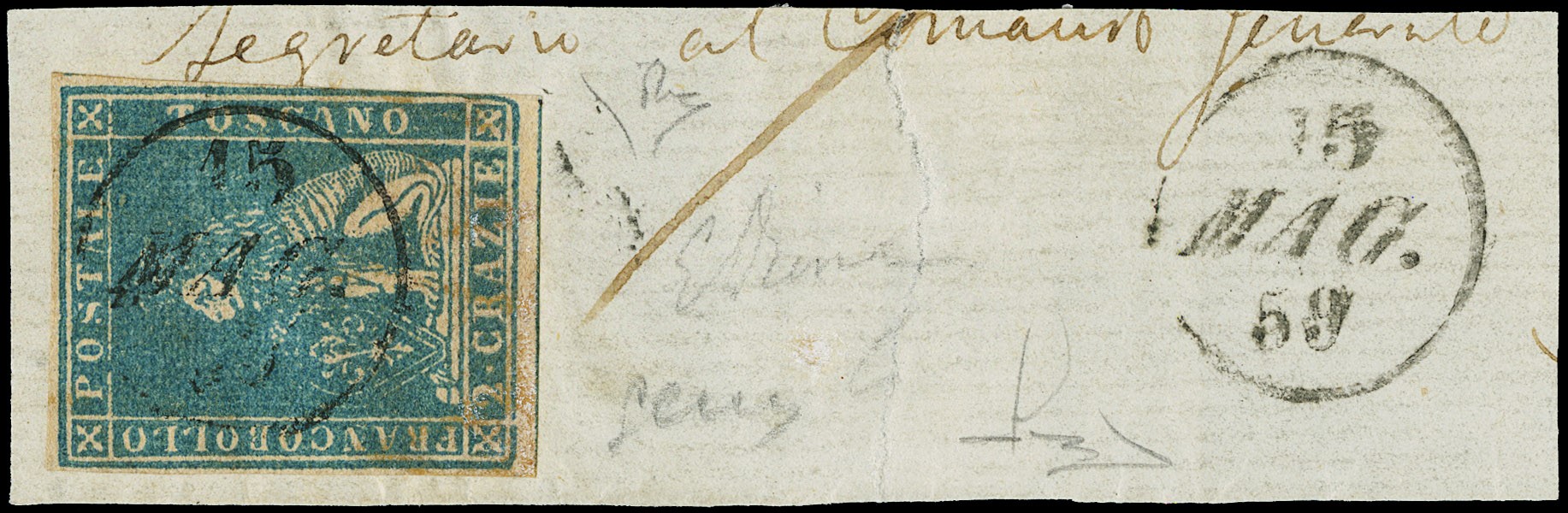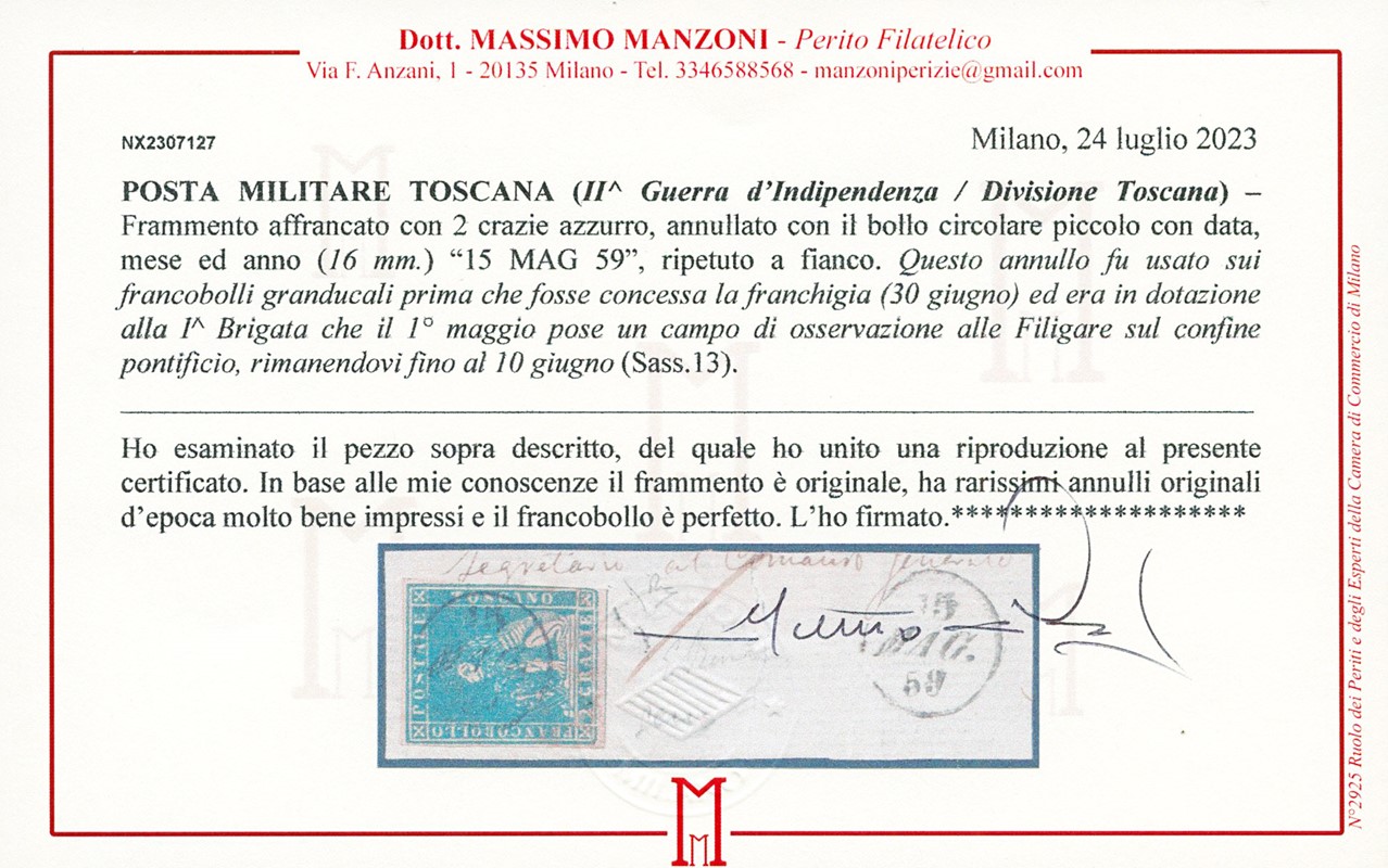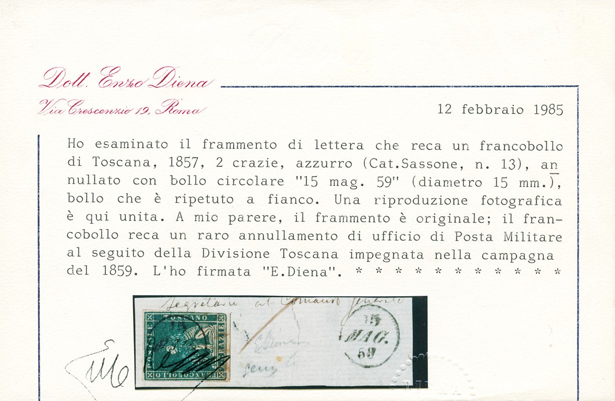 1859 - 2cr blue, perfect, canceled small 16mm cercle '15 MAG. 59', used by the Tuscan division engaged in the campaign of 1859. Rare. Cert. E.Diena and Manzoni (Sassone 13+pt.R3 - Euro 7.000)