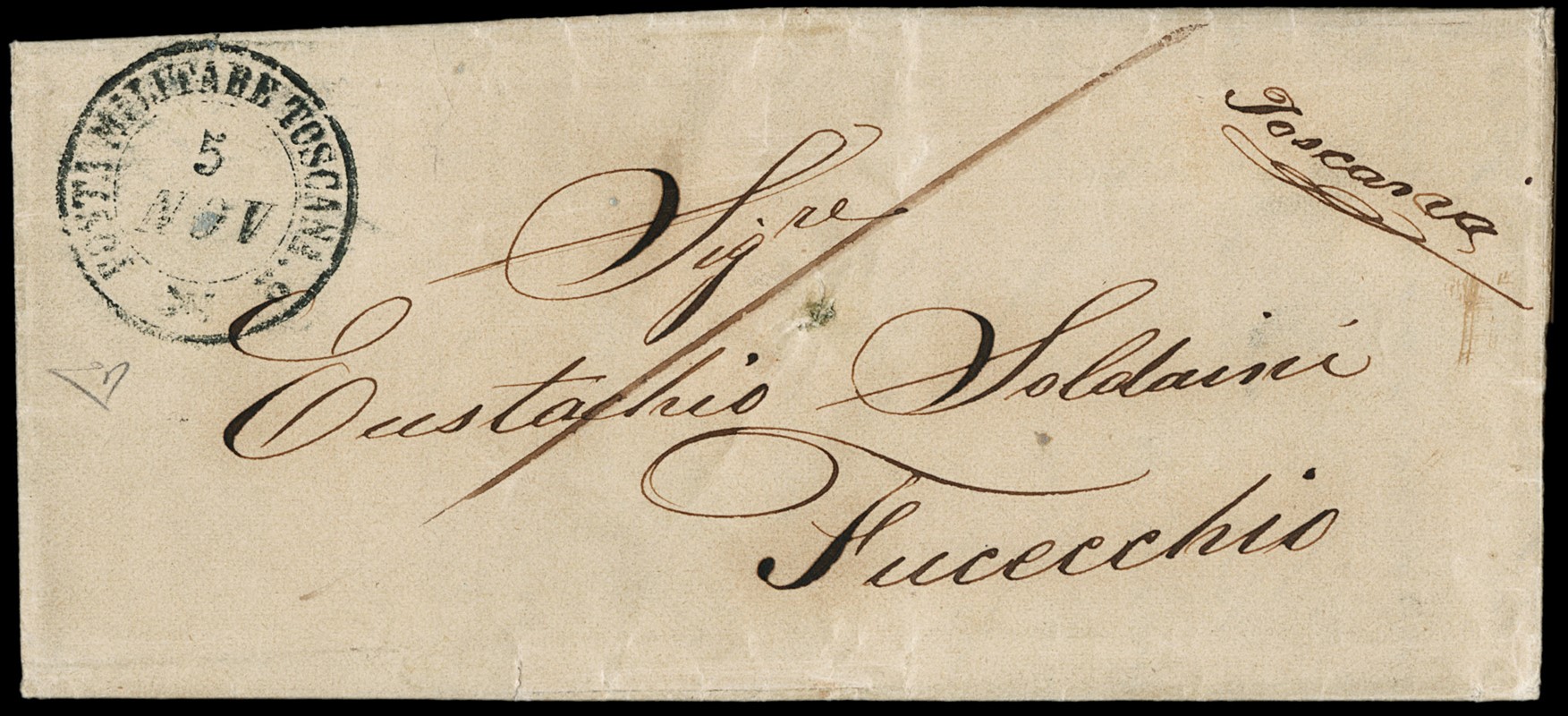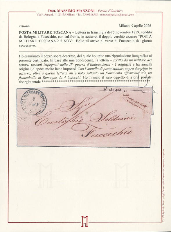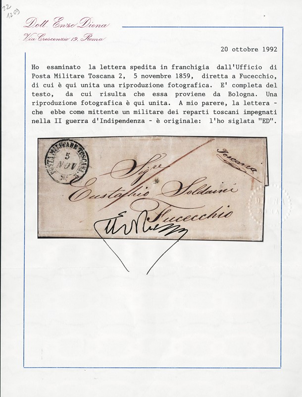 1859 - Unfranked cover dated 5 November 1859, sent from Bologna to Fucecchio, with a double-circle mark 'POSTA MILITARE TOSCANA 2 – 5 NOV' in blue on the front. One of only two known covers with this cancellation in blue, in addition to a Romagna-franked fragment. A rare item in this area. Detailed certificate: E.Diena (Sassone - Euro -)