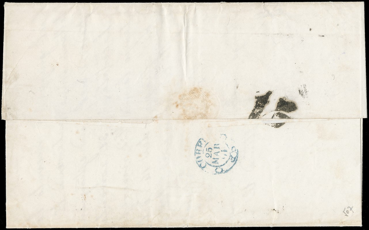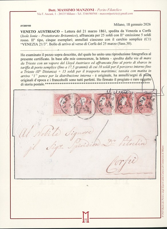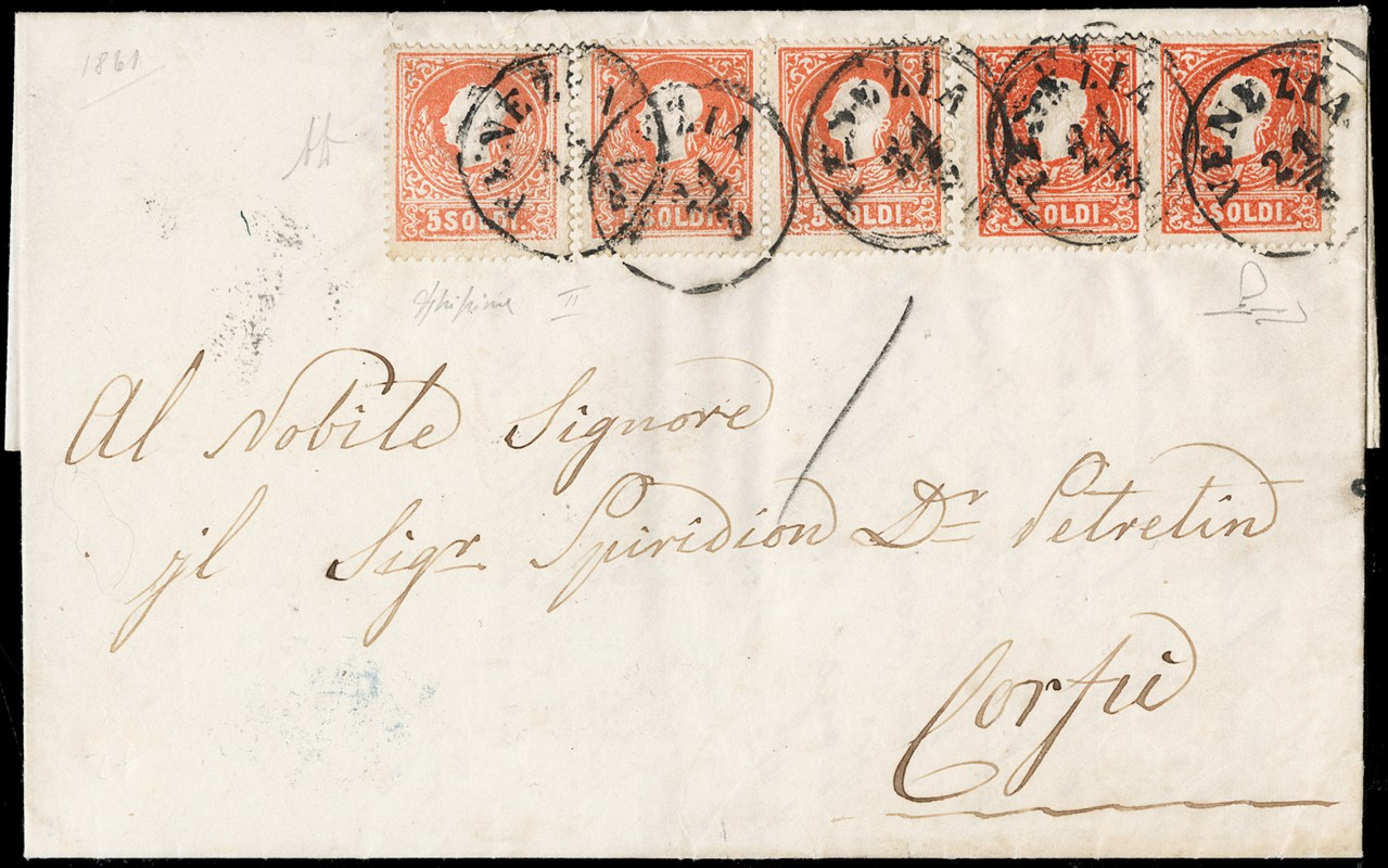 1859 - Lombardy Venetia, 2nd issue, 5s red, type II, five copies from 'VENEZIA 21/3' (1861) to Corfu (Ionian Islands – British Protectorate). Reverse with arrival 'CORFU 25 MAR 61' in blue. Rare postal item both for the franking and the destination. Initials A.Diena and Ghiglione, cert. Manzoni (Sassone 30 – Euro –)