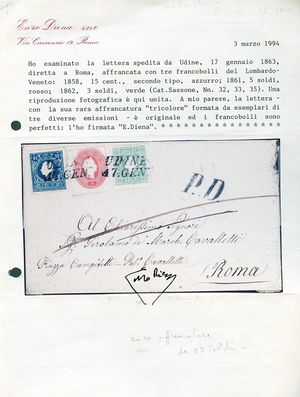 1859/62 - Lombardy Venetia, 15s blue, 2nd issue type II, 5s red and 3s yellow-green, 3rd issue, from 'UDINE 17 JAN' to Rome. Cert. E.Diena (Sassone 32+33+35 – Euro –)