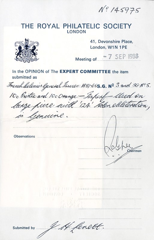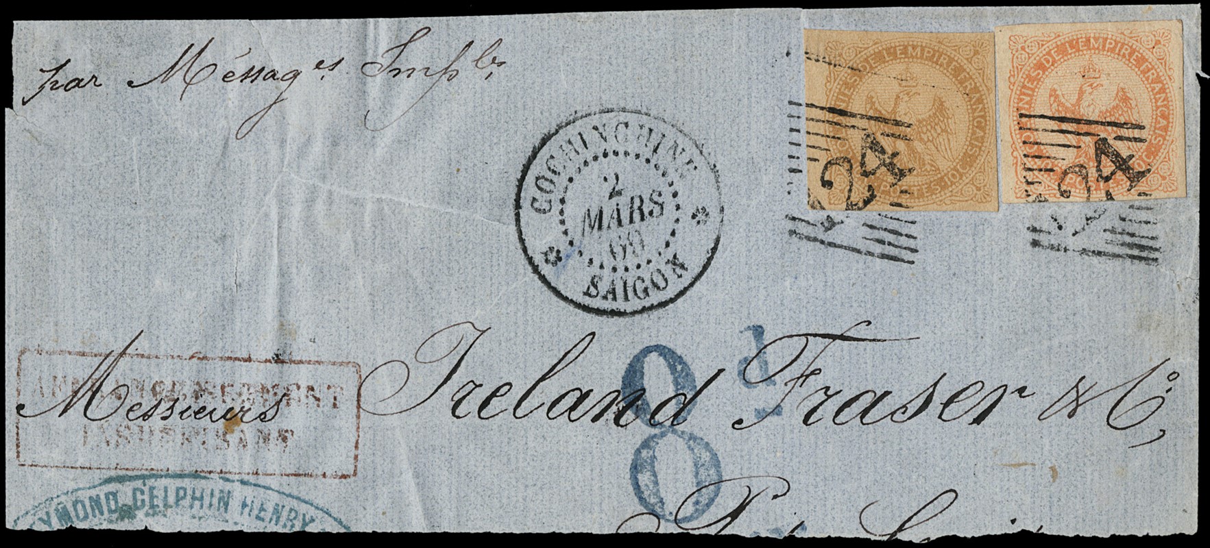 1859/65 - CONCHINCHINE: Aquilette 10c and 40c, both with excellent margins and cancelled with Aden numeral '124', on large fpiece of cover from 'SAIGON * COCHINCHINE * 2 MARS 69' to Port Louis, Mauritius. On front blue '8 d' rate marking. Unrecorded cancellation on these stamps. Cert. Royal Philatelic Society London (Yvert 3 + 5 – Euro –)