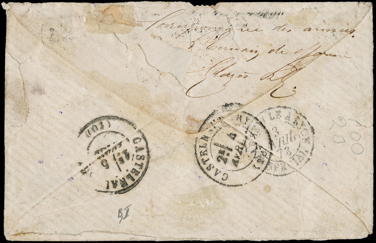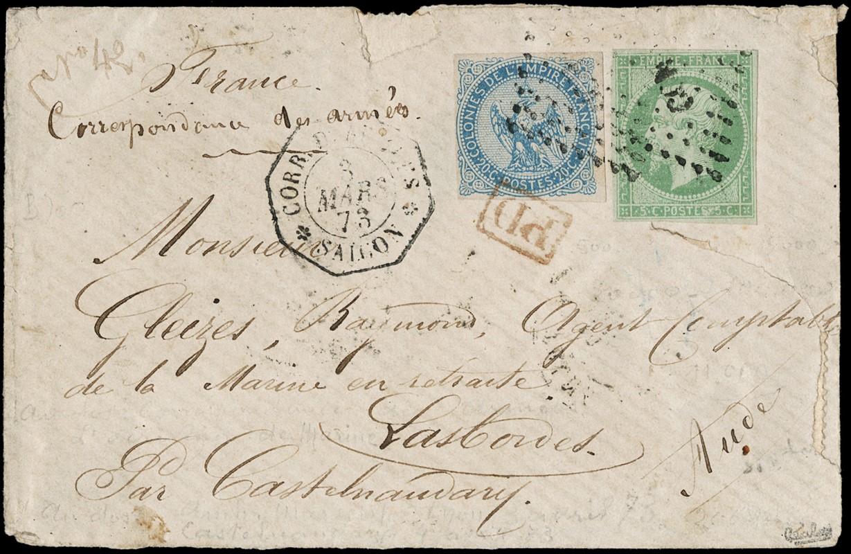 1859/71 - CONCHINCHINE: Aquilette 20c blue and Napoleon III 5c green, both well margined, from 'CORR. D’ARMe'ES SAIGON * 3 MARS 73 *' to Castelnaudary. Calves handstamp (Yvert 4 + 8 – Euro –)