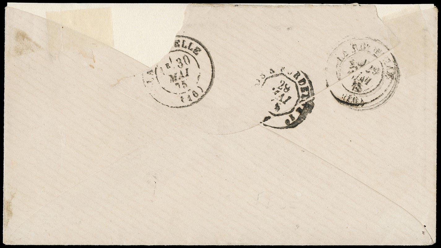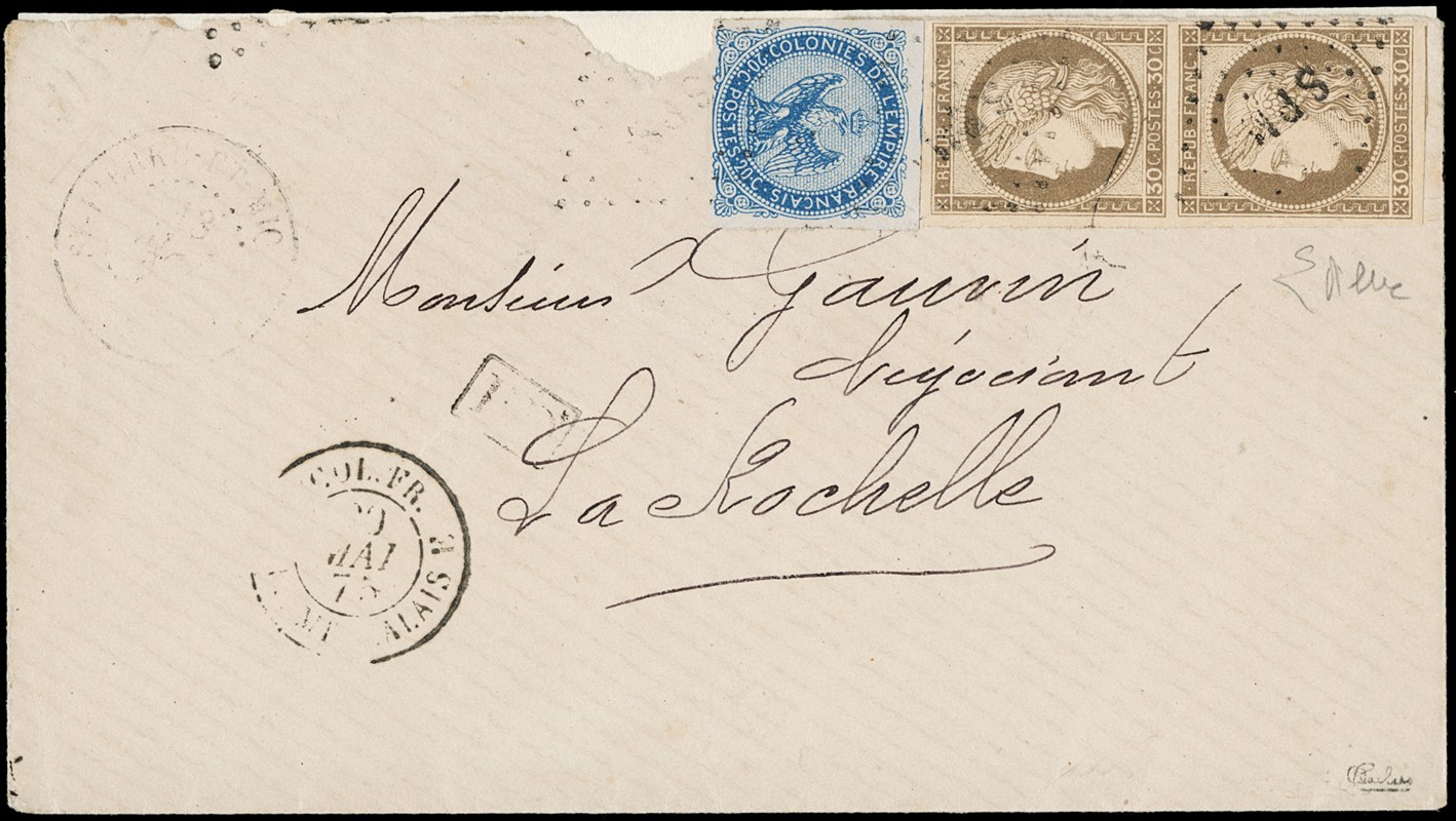 1859/77 - ST.PIERRE AND MIQUELON: Aquilette 20c blue and Ceres 30c brown, pair, all with excellent margins, cancelled with dotted grid 'SPM' and double circle 'COL. FR. 30 MAI 75' on cover to La Rochelle (France). Calves handstamp, fully signed E.Diena (Yvert 4 + 20 – Euro –)