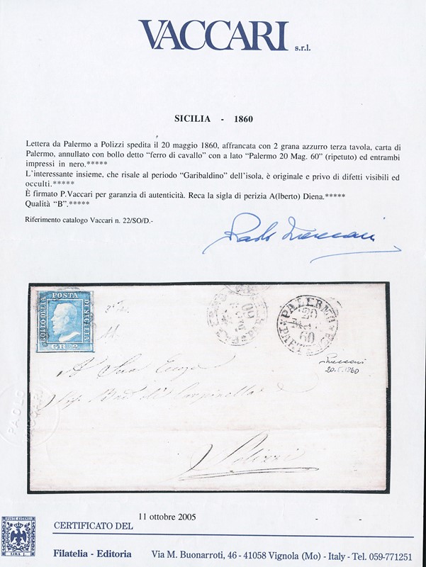 1860 - 2gr light blue, 3rd plate, from 'PALERMO 20 MAG 60' to Polizzi. Interesting and rare usage during the Garibaldian period. Signed A.Diena, CF Vaccari (Sassone 8d - Euro 1,000)