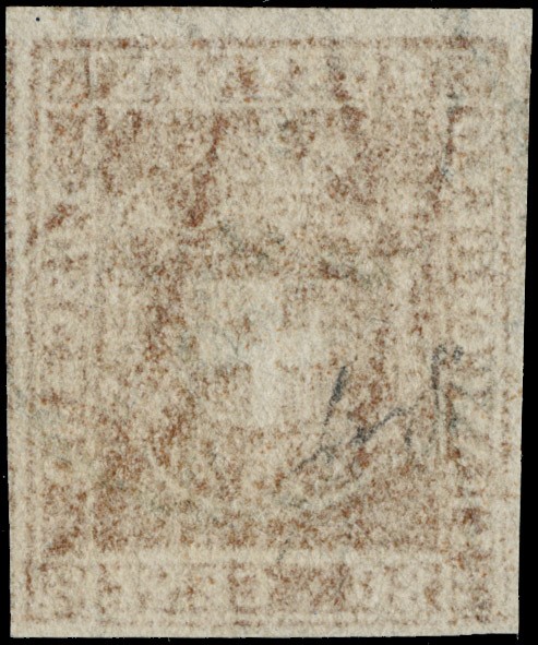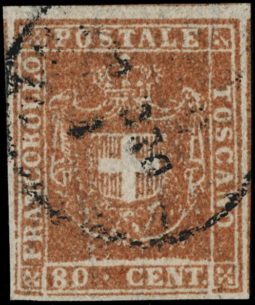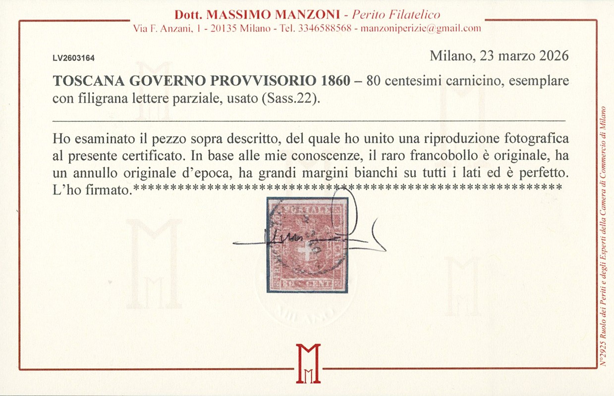 1860 - 80c flesh-red, large white margins on all sides with partial watermark letters, used. Signed A. Fiecchi; cert. Manzoni (Sassone 22 - Euro 2,500)