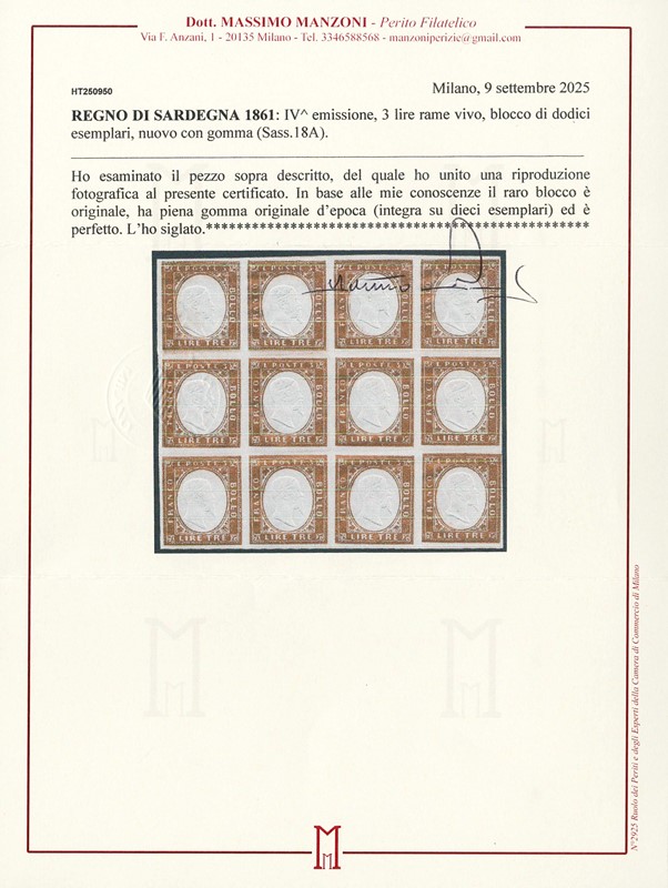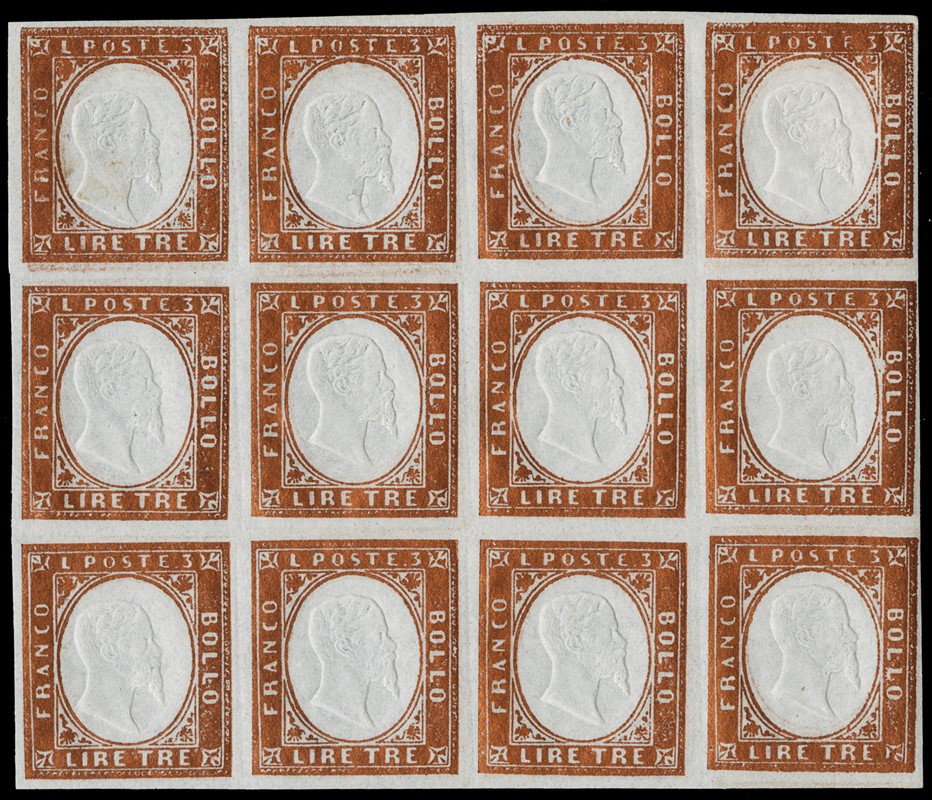 1861 - 3 Lire bright copper, block of 12 with 10 stamps never hinged. Rare and very fresh. Signed E.Diena and Manzoni (Sassone 18A - Euro 21,000+)