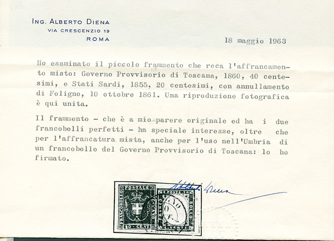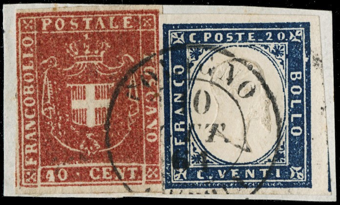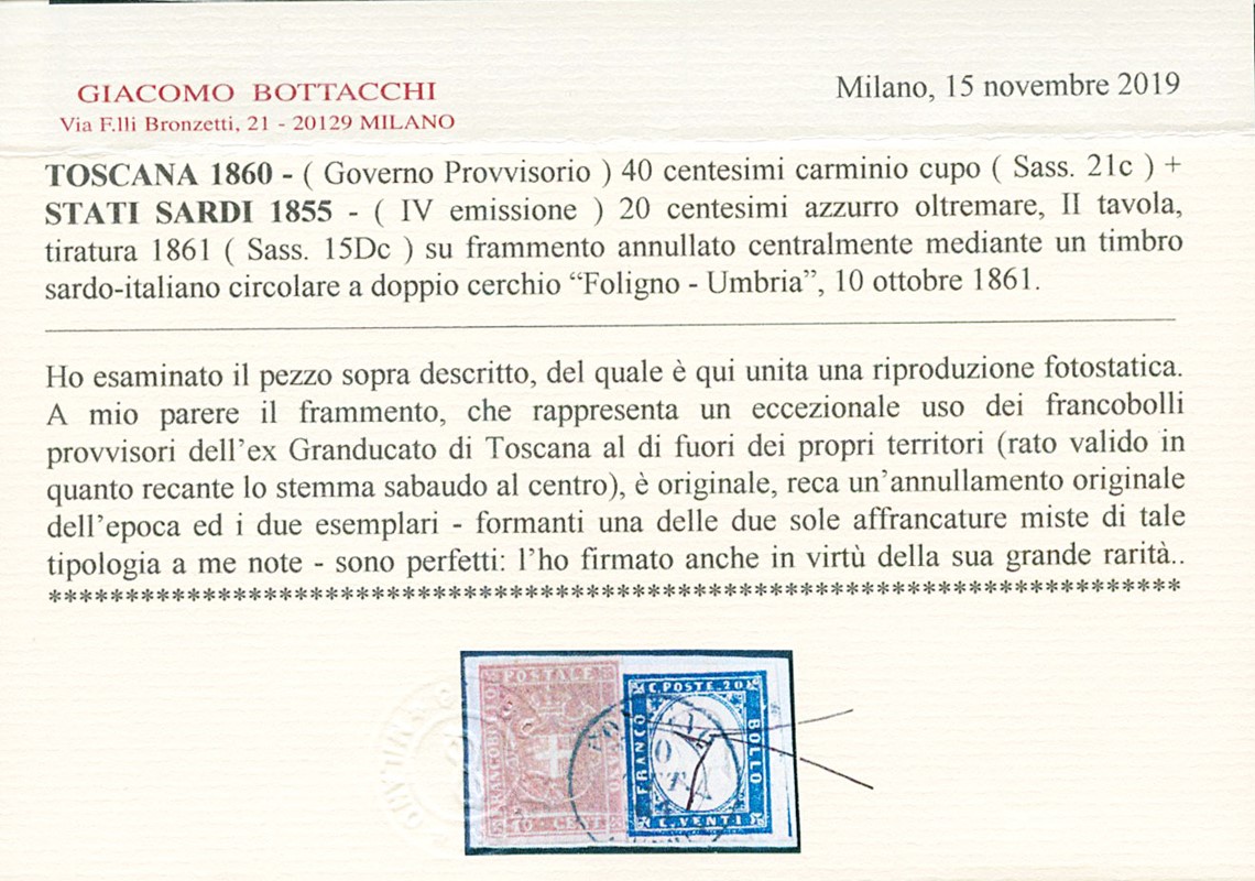 1861 - 40c deep carmine, in mixed franking with Sardinia Fourth Issue 20c ultramarine, 2nd plate, printing of 1861, cancelled 'FOLIGNO UMBRIA 10 OTT. 61'. Extremely rare usage of the Tuscan Provisional Government issues in Umbria and in mixed franking. Su