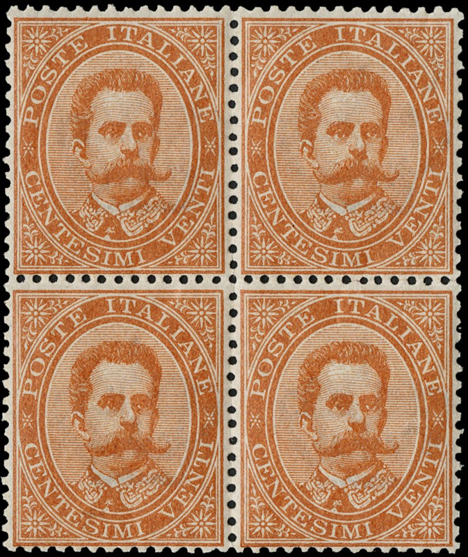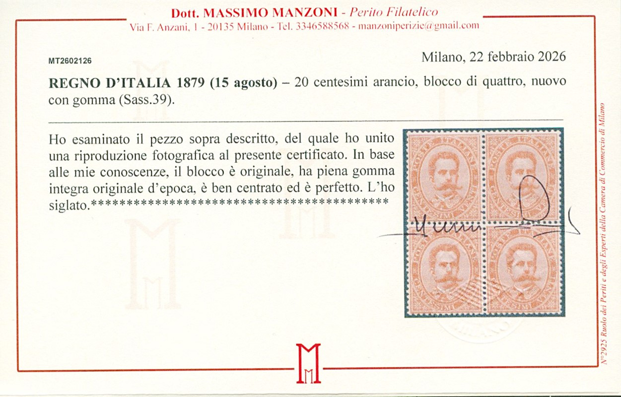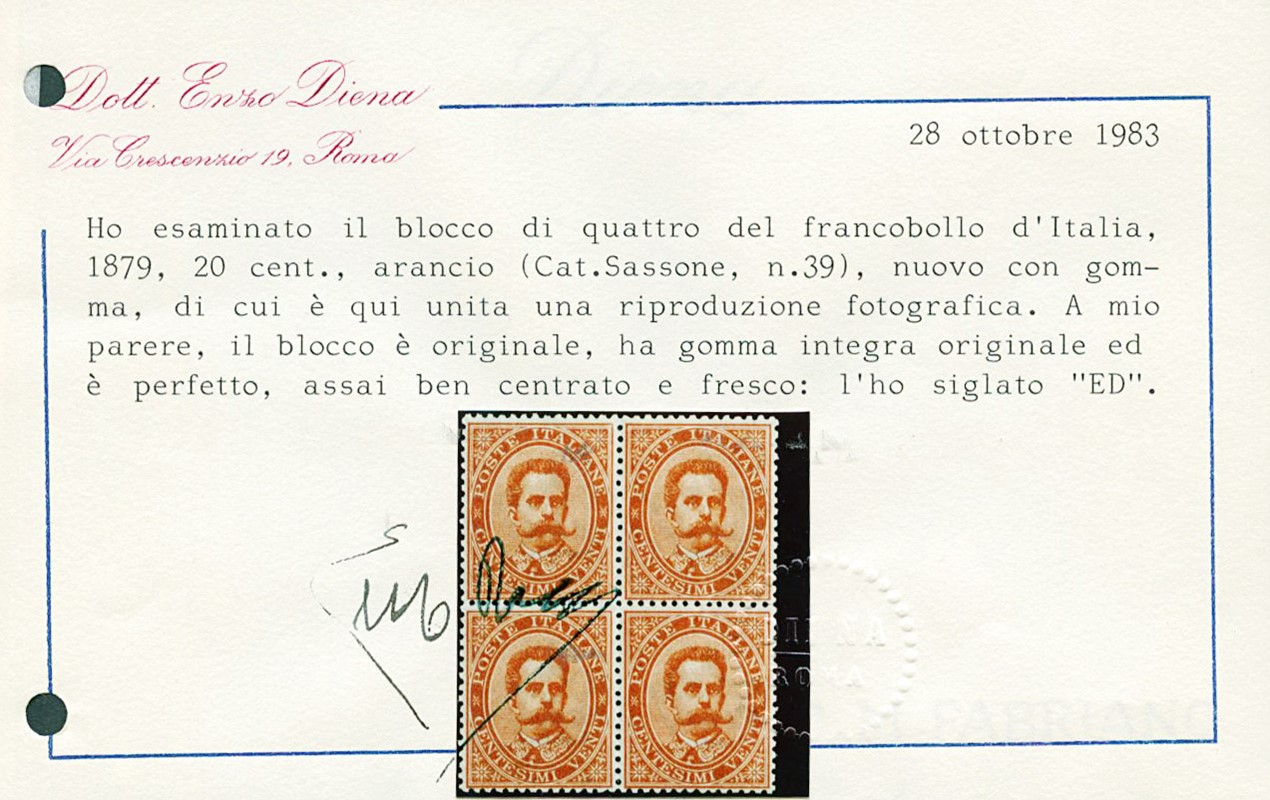 1879 - Umberto I, 20c orange, block of four, very fresh, good/very fine centring, MNH. Certs. Enzo Diena and Manzoni (Sassone 39 – Euro 6,600 / 26,600+)