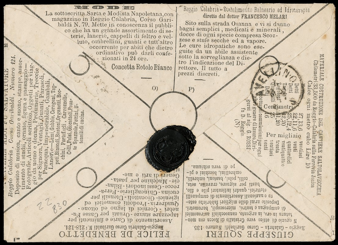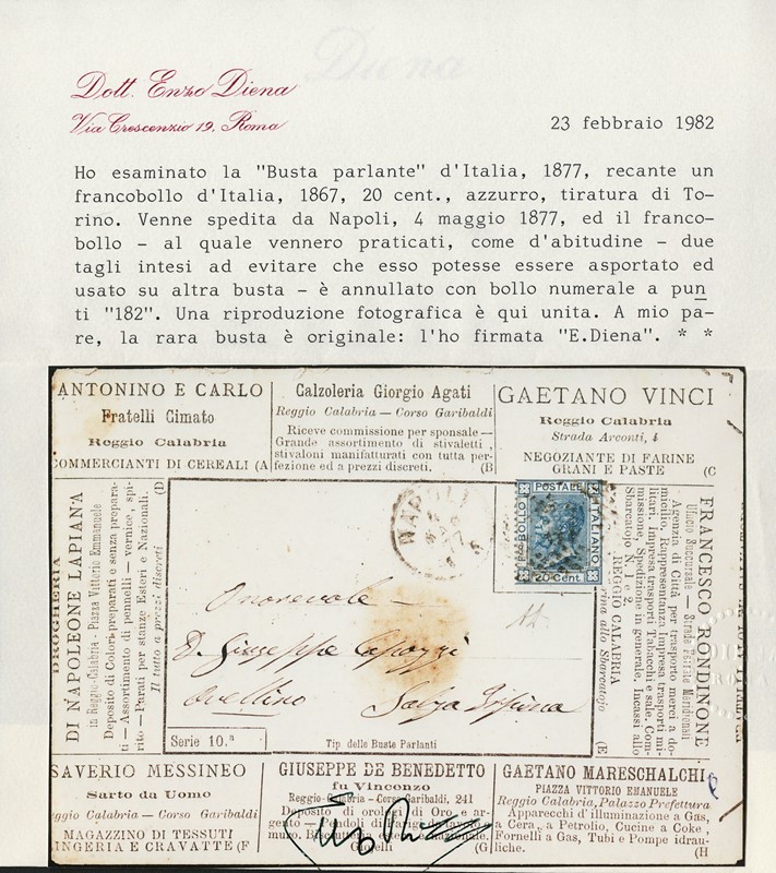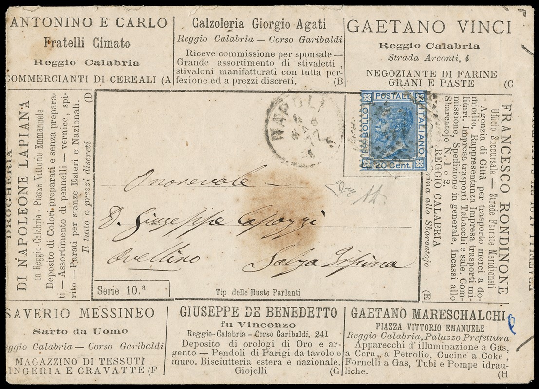 1877 - 20c blue Bigola with usual razor cuts, on 'talking' envelope from 'NAPOLI 4 MAGGIO 1877' to Avellino. Rare. Cert. E.Diena (Sassone BP2 - Euro 65.000)
