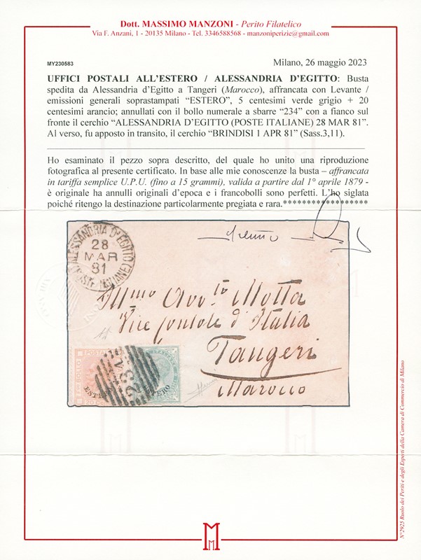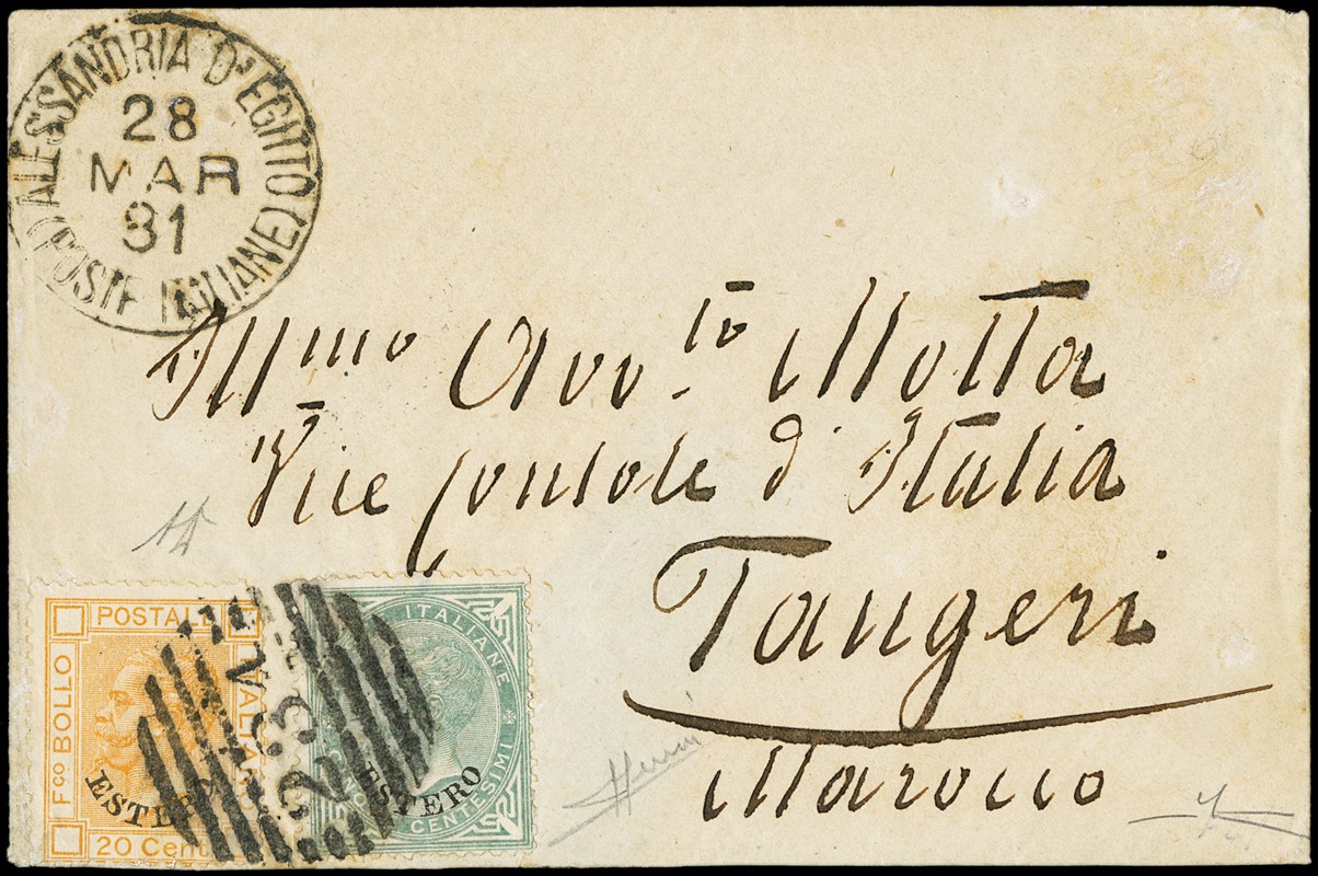 1881 - General Issues: Alexandria (Egypt) 5c green grey and 20c orange overprinted 'ESTERO', canceled barred numeral '234' from 'ALESSANDRIA D'EGITTO POSTE ITALIANE 28 MAR 87' to Tangeri (Maroc). Rare destination and interesting. Initials A.Diena and Sorani, Cert. Manzoni (Sassone 3+11 - Euro -)