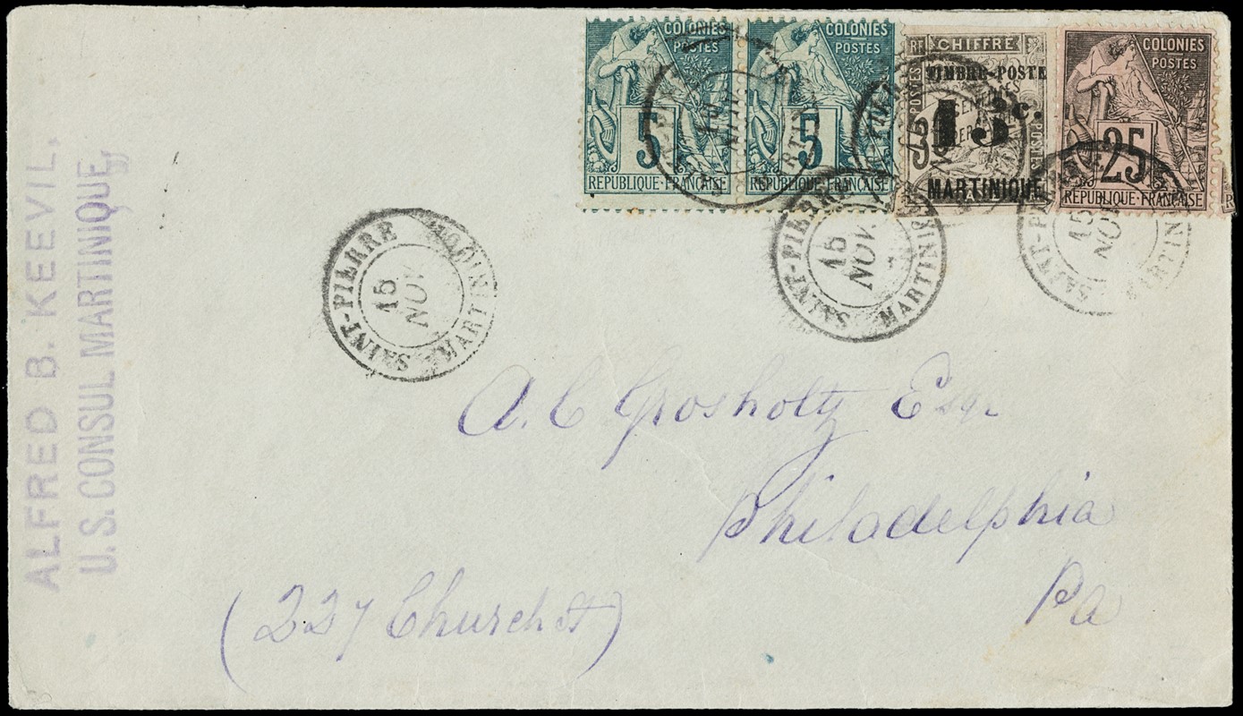 1881/92 - MARTINICA: General Issues Alphee Dubois 5c green (pair) and 25c black and rose, in mixed franking with Martinique and Postage due 15c on 30c black, on cover from 'SAINT PIERRE MARTINIQUE 15 NOV.' to Philadelphia (USA). Superb combination for a rare destination (Yvert General Issues 49–54 + Martinique 22 – Euro –)