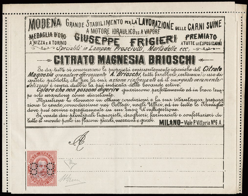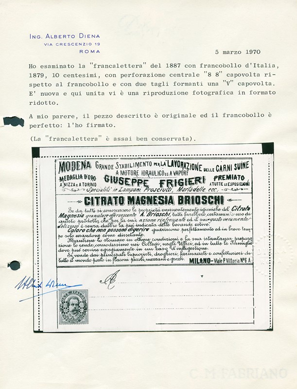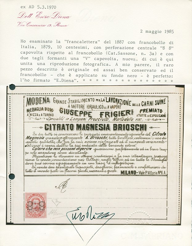 1887 - Umberto I, 10c carmine perforated '8-8', inverted perforation, on unused postal stationery card. V-shaped cut on the stamp to prevent attempts at reuse of the 10c. Superb and rare. Certs. A.Diena and E.Diena (Sassone FR3a – Euro 85,000)