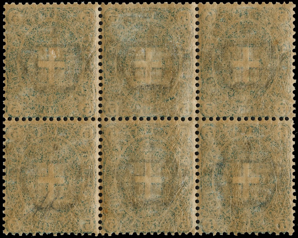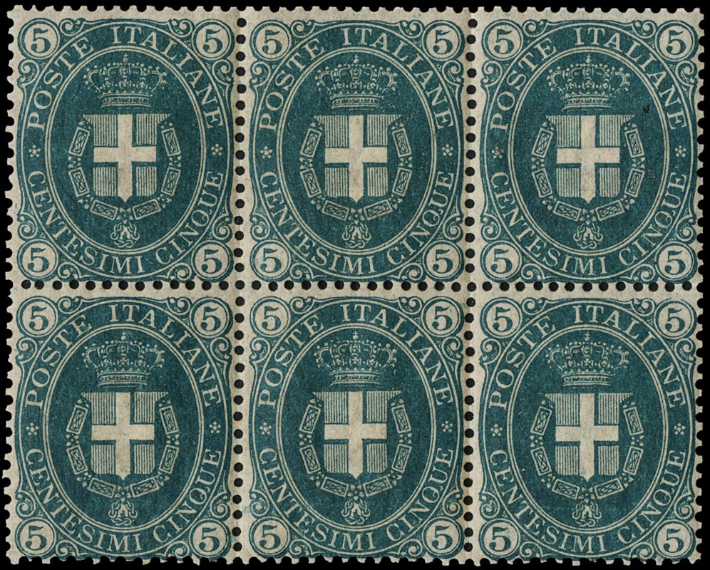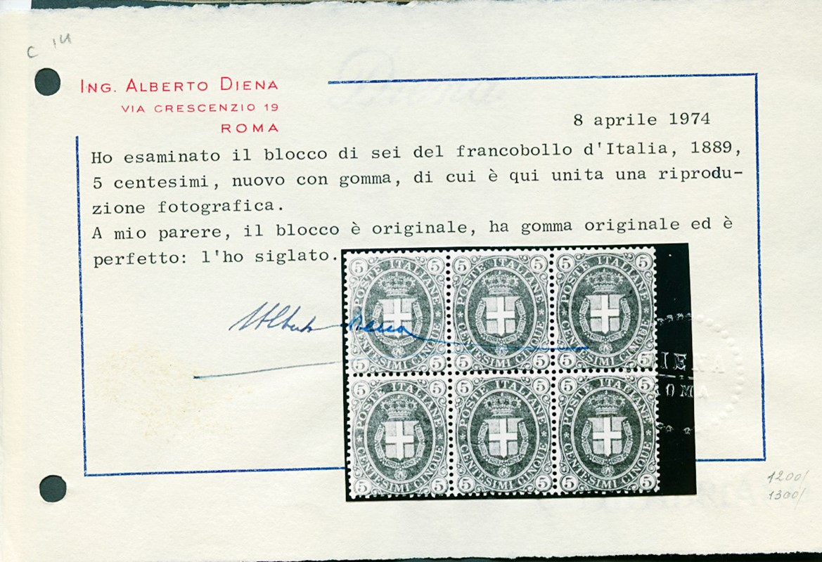 1889 - Umberto I, 5c dark green, mint block of six (BL6), fine centred, 4 copies MNH. Cert. A.Diena (Sassone 44 – Euro 19,000+)