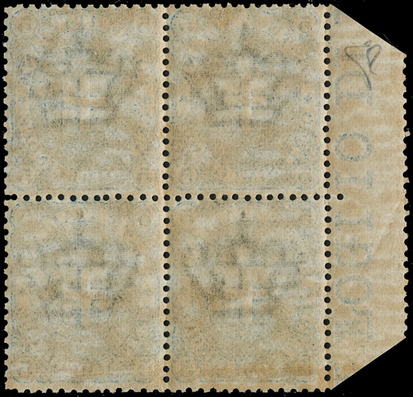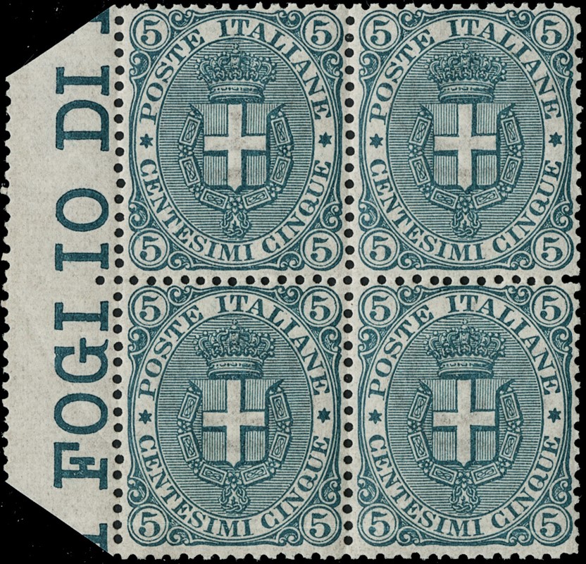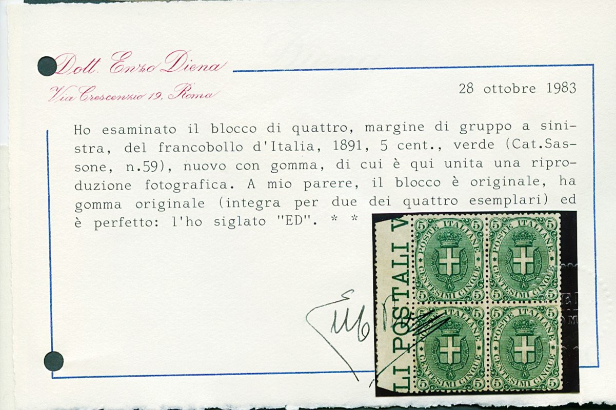 1891/96 – 5c green block of four with left sheet margin, well centred. Two stamps MNH (the two lower ones with slight horizontal paper wrinkle, not counted). Cert. E.Diena (Sassone 59 – Euro 3,300 for the pair)