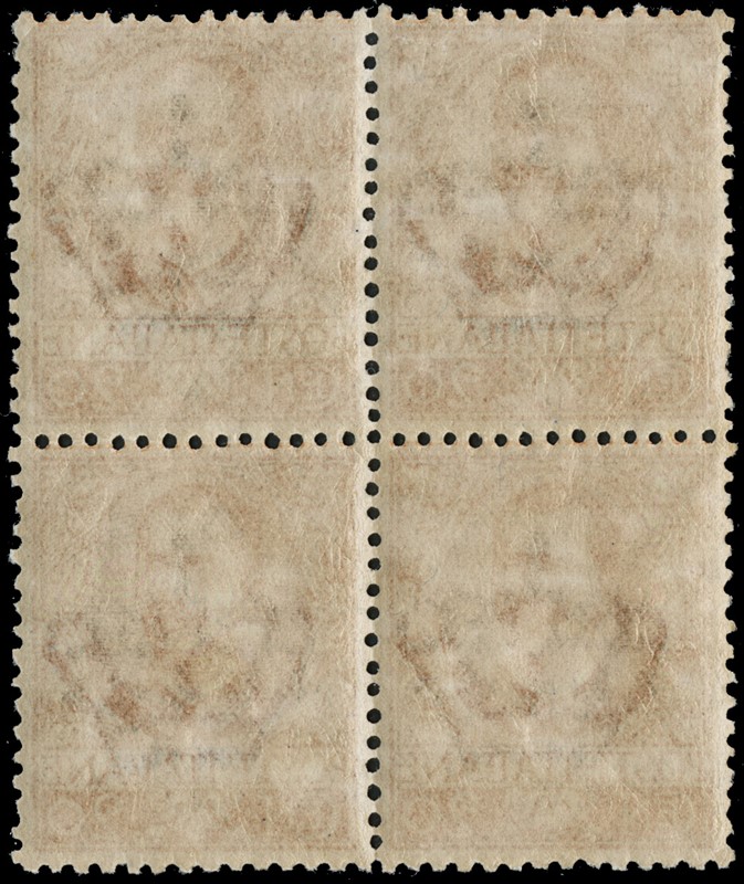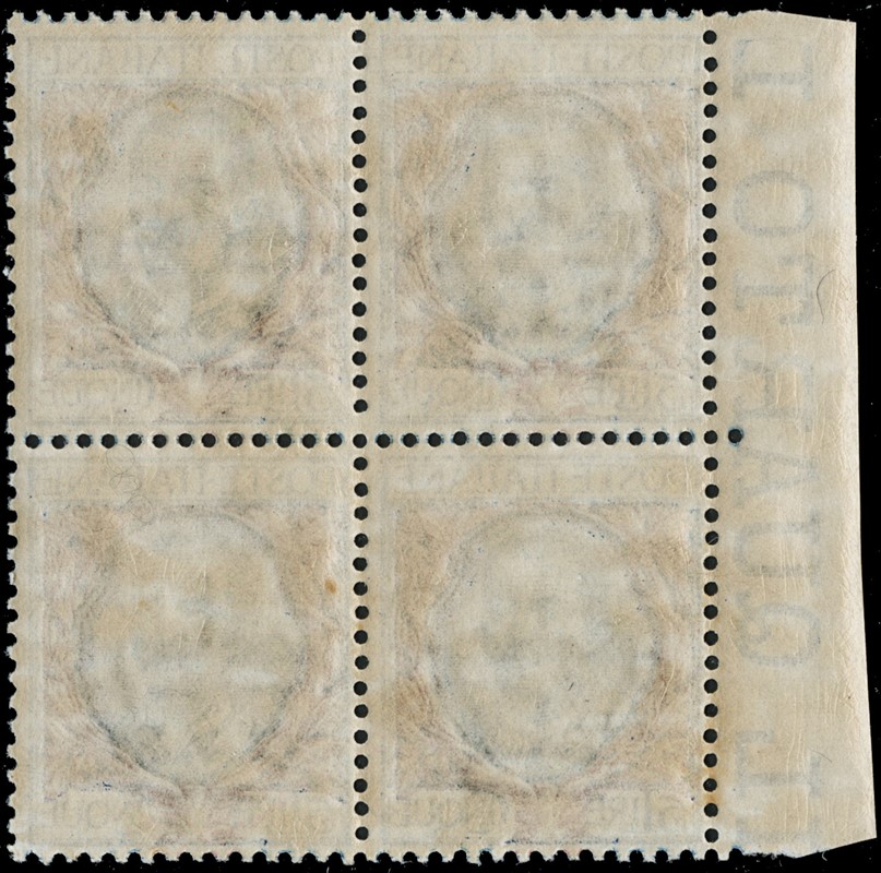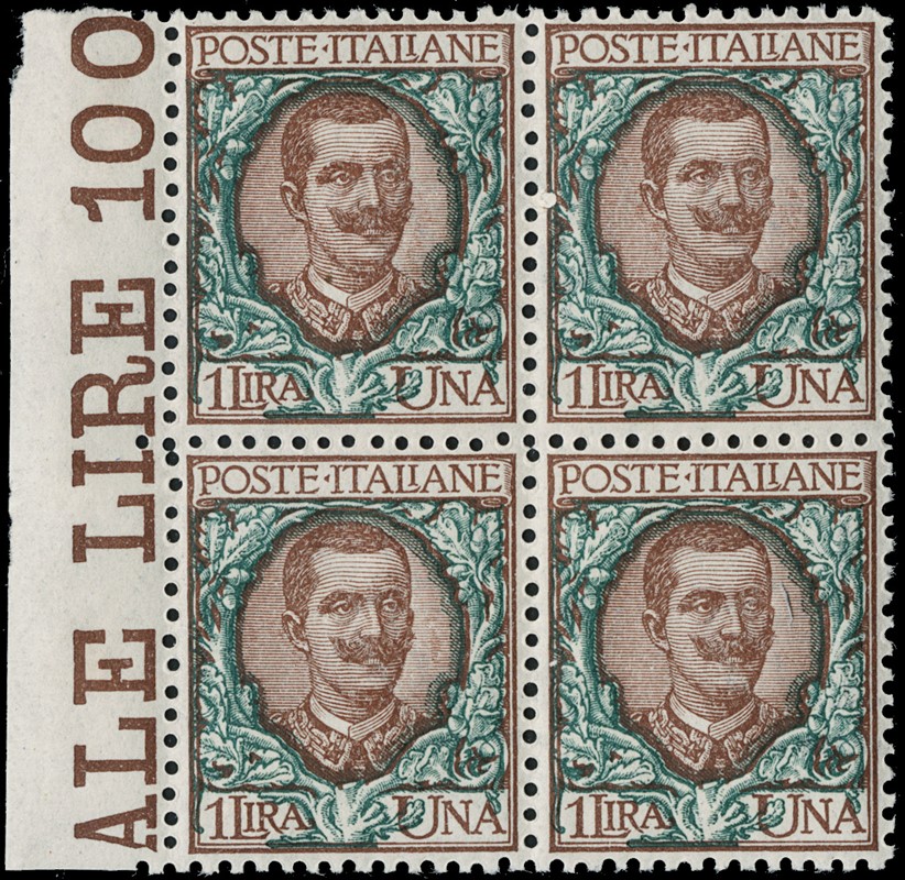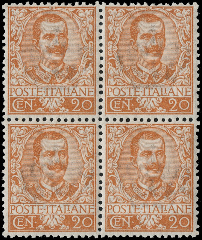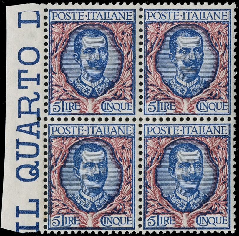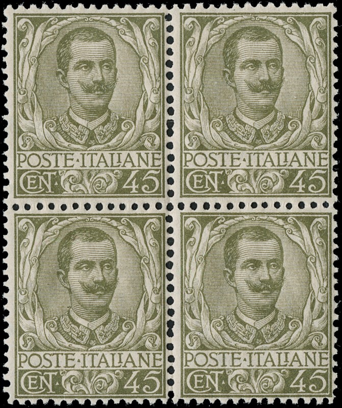 1900 – Floreal, 20c orange, 45c olive, 1L brown and green, 5L blue and rose, all in blocks of four (BL4), MNH; 1L and 5L with sheet margin, 20c and 1L well centred (Sassone 72+75+77/78 – Euro 3,840)