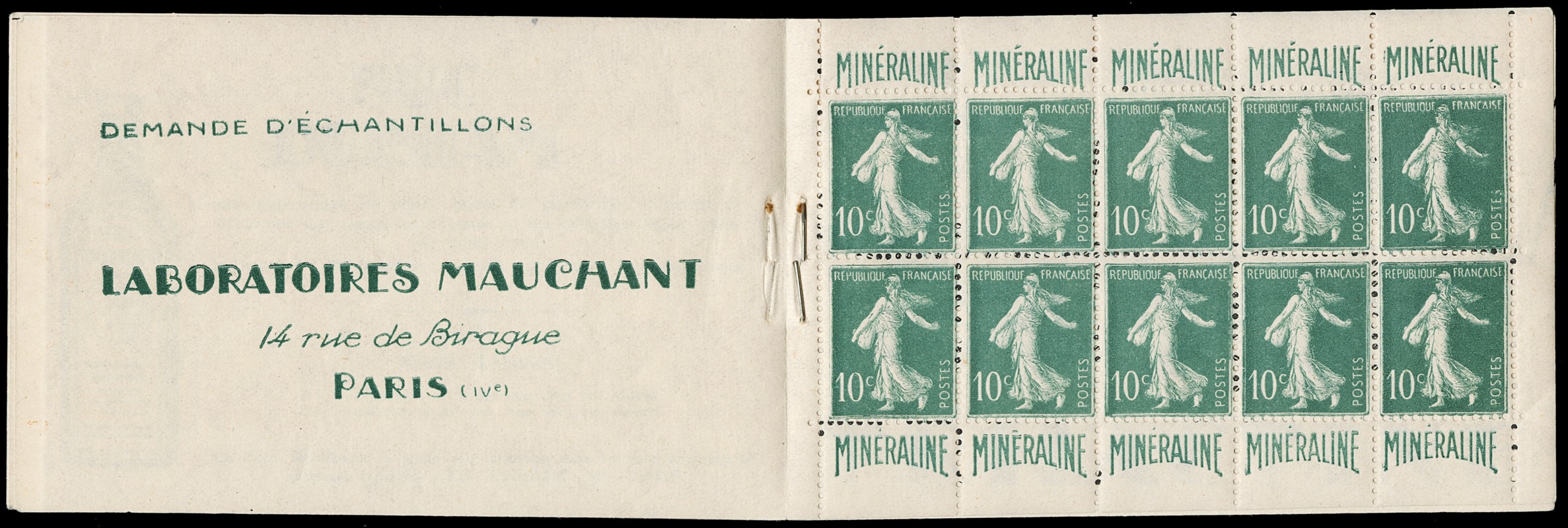 1900 - France: 'Mineraline' booklet, containing sheetlet of 10 x 10c green Semeuse, superb (Yvert 188a – Euro 7,500)