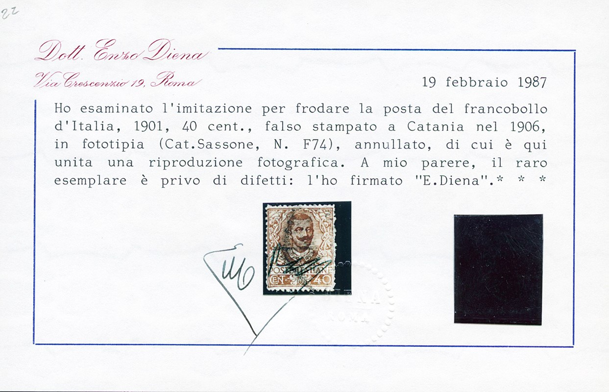 1901 - Floreal, 40c brown Catania forgery 1st type, used in good conditions. Cert. E.Diena '…the rare copy is without defects' (Sassone F74 - Euro 17.500++ - the value of Sassone for these stamps refers to defective copies)