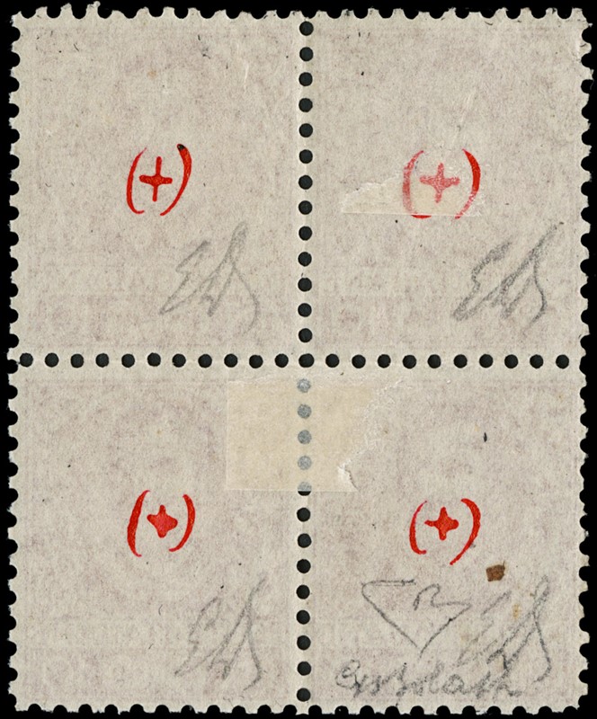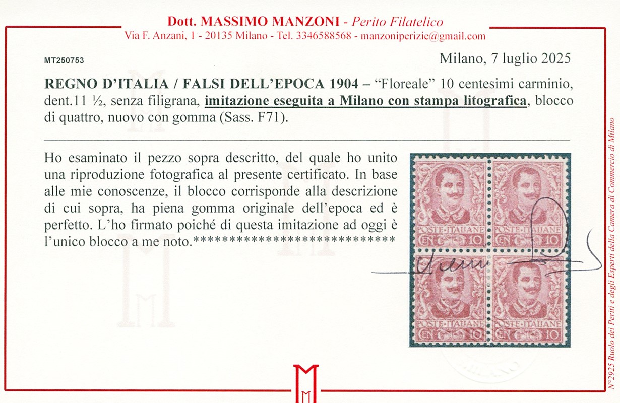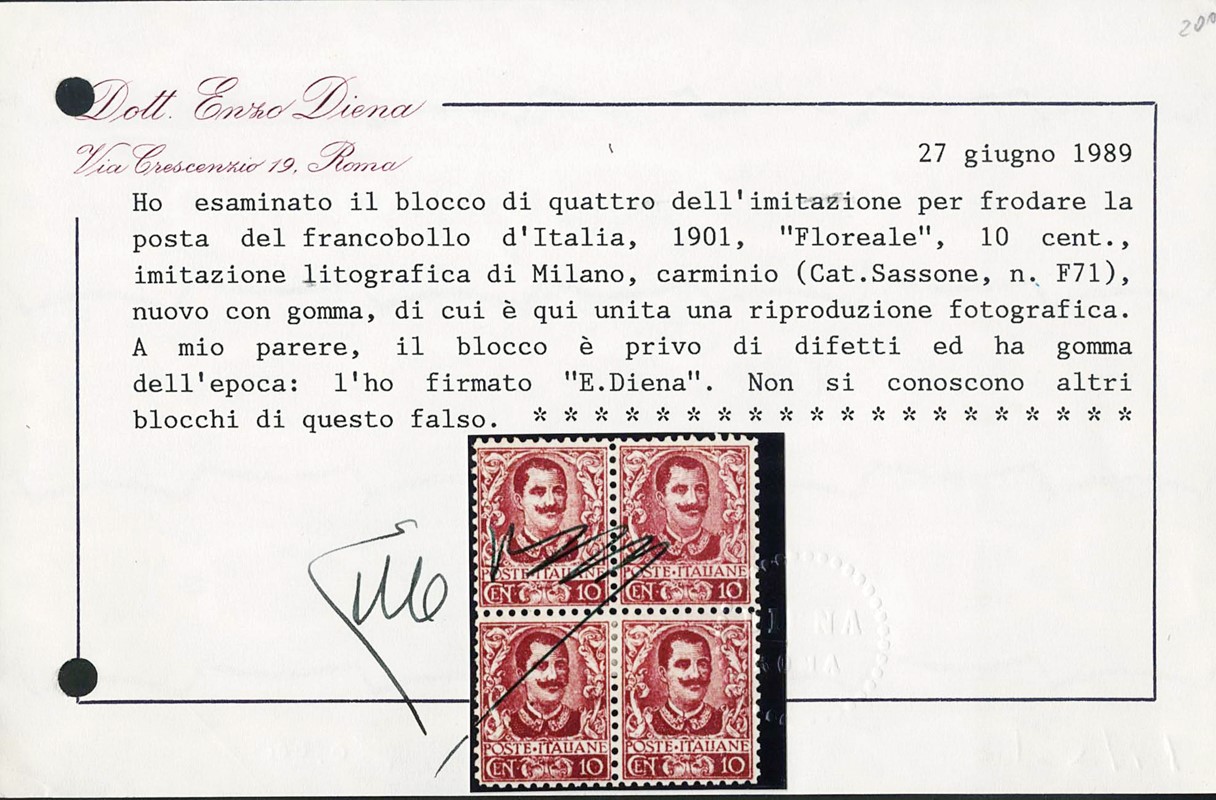 1904 - Floreal, 10c carmine, Milan forgery, lithographed printing, block of four, mint. Unique. Signed G. Bolaffi on the block and E.Diena on each stamp; certs. Manzoni and E.Diena: '…no other blocks of this forgery are known' (Sassone F71 – Euro 50,000+)