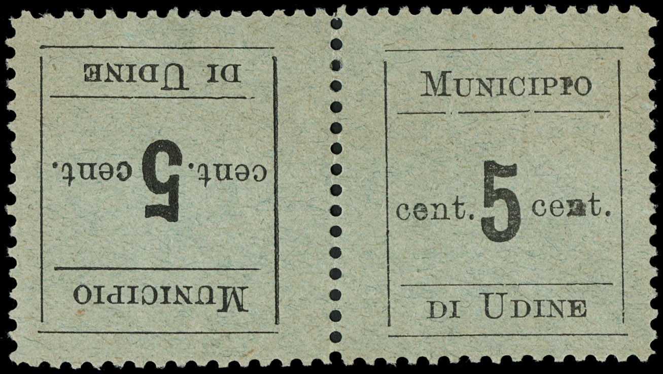 1918 - Udine town hall: 5c black, an MNH copy and a tete-beche pair perforated on four sides (initials Fiecchi), plus a used normal copy and one perforated on four sides (Sassone 1tl+1US+1aUS+1dUS - Euro 5.390)
