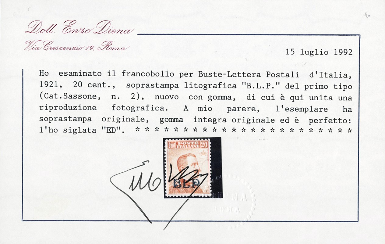 1921 - BLP, lithographic overprint 1st type, 20c orange, fine centering, MNH Initials Em. and A.Diena, cert. E.Diena (Sassone BLP2 - Euro 5,000+)