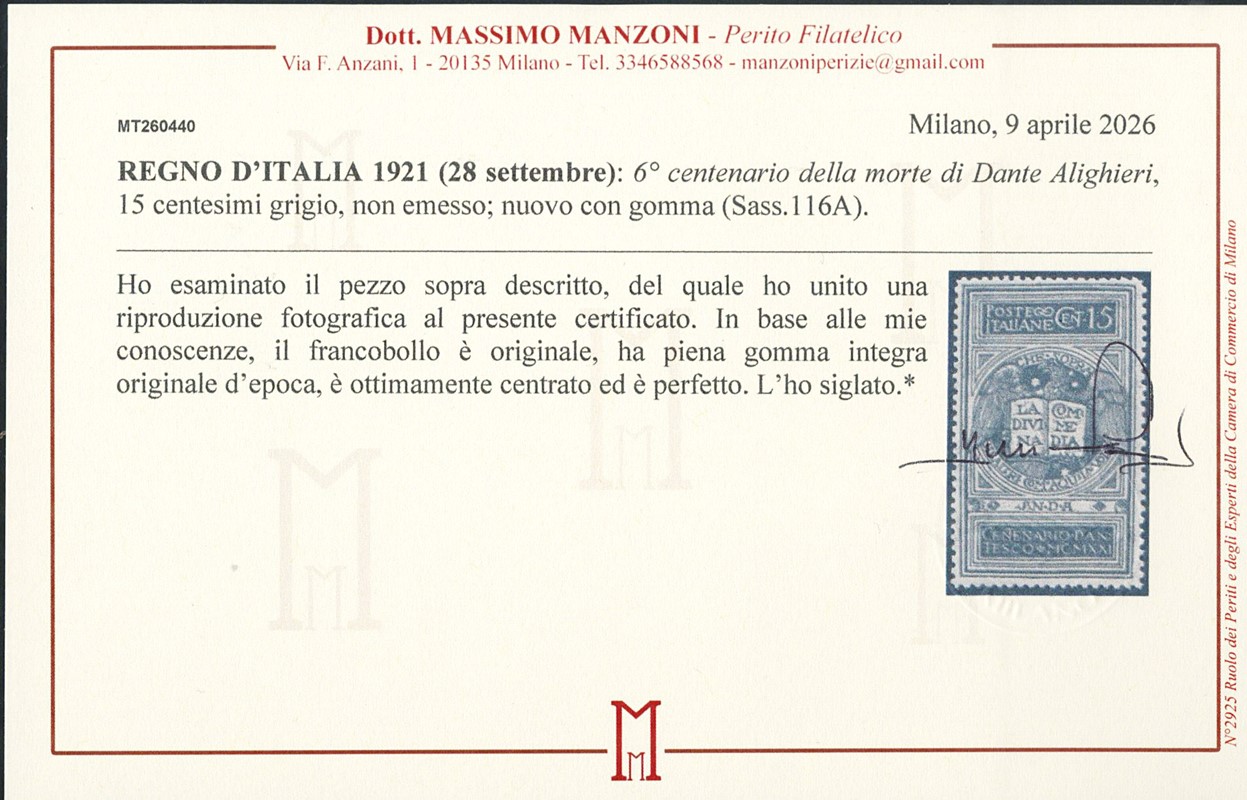 1921 - Dante, 15c grey, unissued, MNH and superbly centred. Cert. Manzoni (Sassone 116A – Euro 1,600)