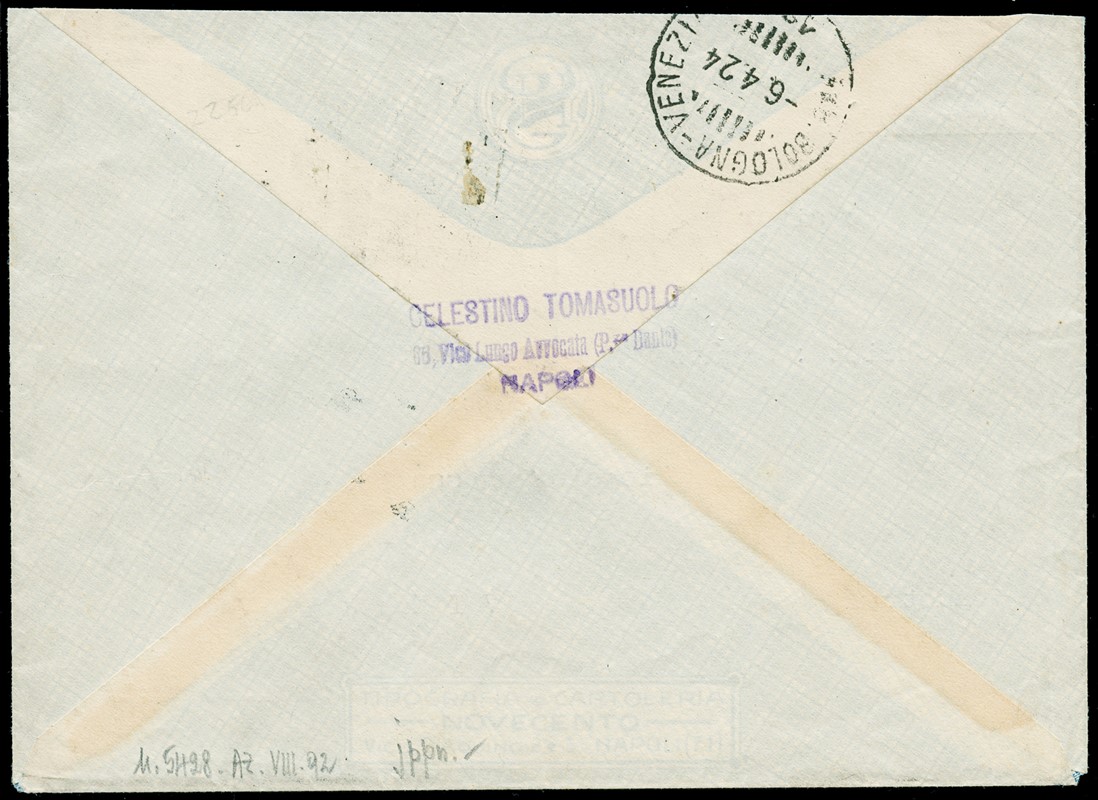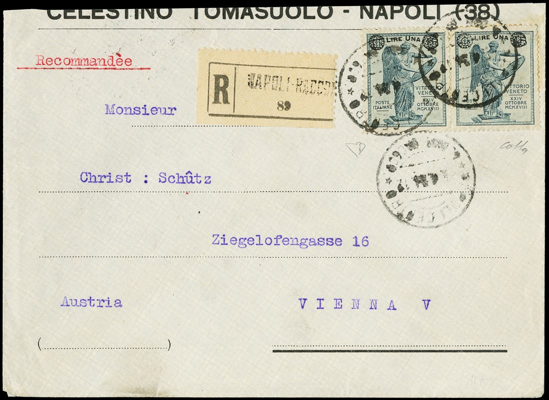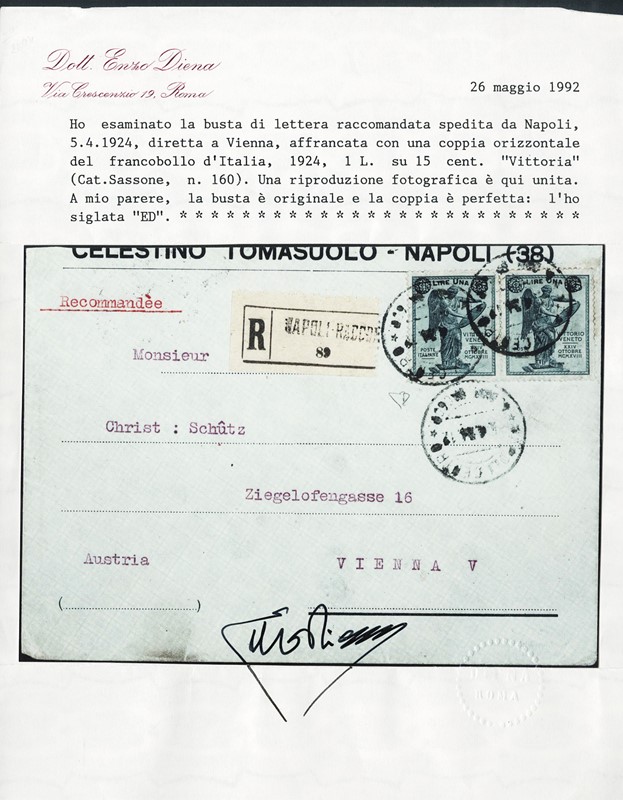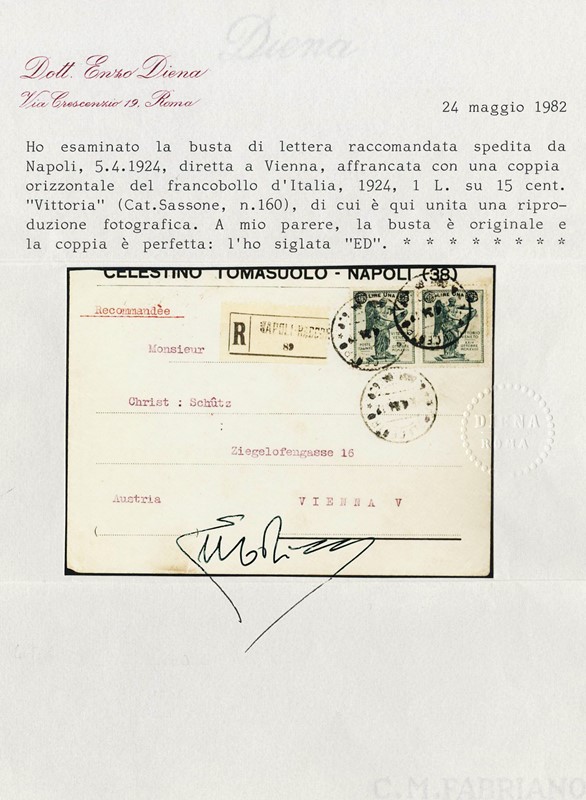 1924 – Winged Victory, 1L on 15c slate, overprinted pair on registered cover from 'NAPOLI 5/4/24' to Vienna. Ex Provera. Two certs. E.Diena and one Colla (Sassone 160 – Euro 7,500)
