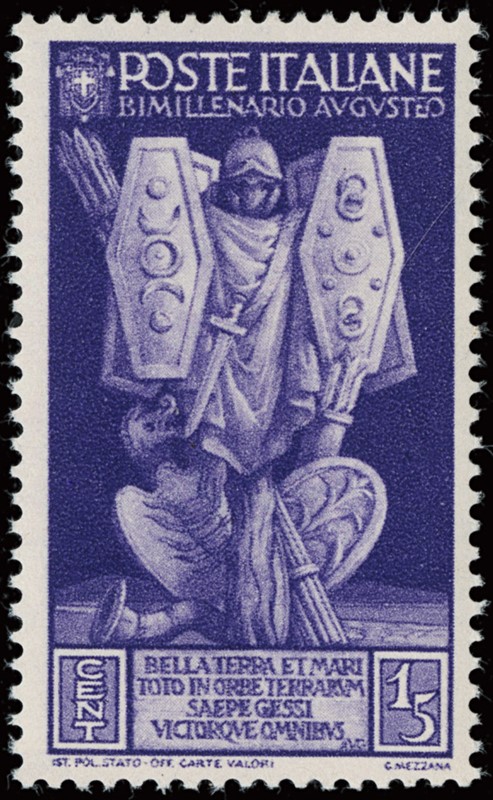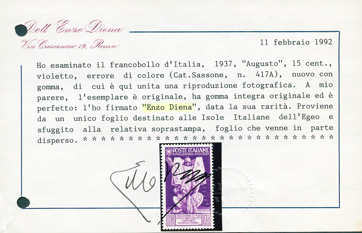 1927 - Augustus, 15c violet in a different shade, well centred. From the unique sheet intended for the Italian Aegean Islands and escaped overprinting, partly dispersed. Very rare. Cert. E.Diena (Sassone 417A – Euro 105,000)
