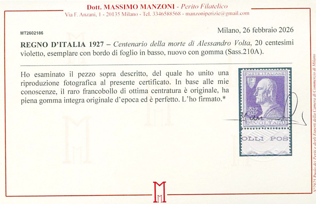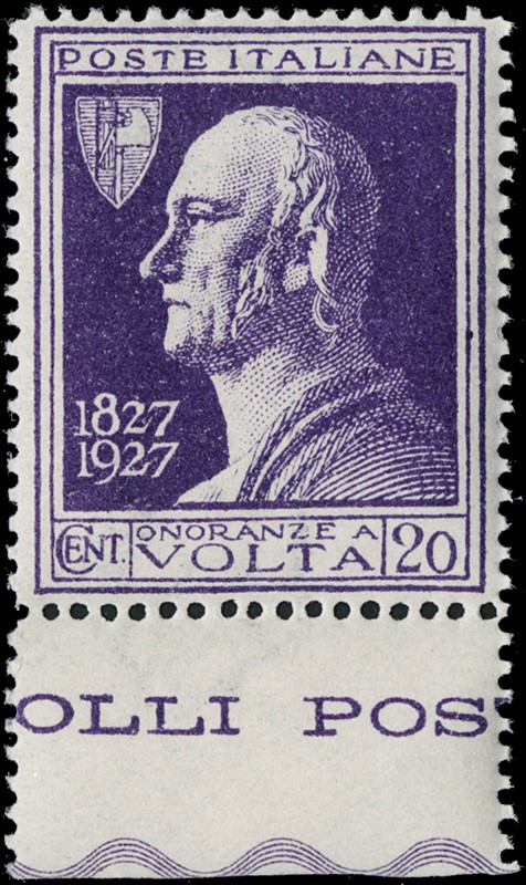 1927 - Volta, 20c violet with sheet margin, MNH and well centred. Cert. Manzoni (Sassone 210A – Euro 9,750/14,750)