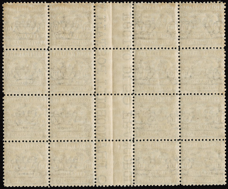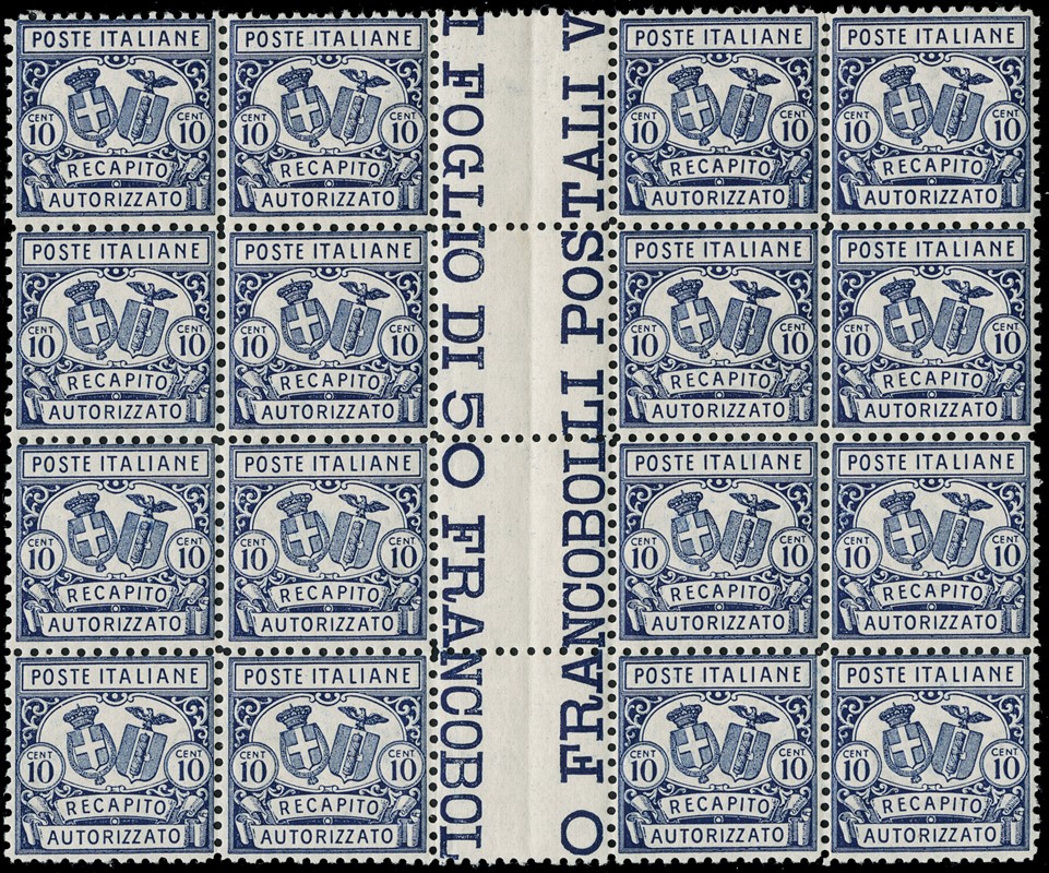 1928 - Authorized Delivery, 10c blue, perf. 11, block of sixteen, MNH with central interpane margin, faine/very fine centring (Sassone 1 – Euro 3,600/9,000)