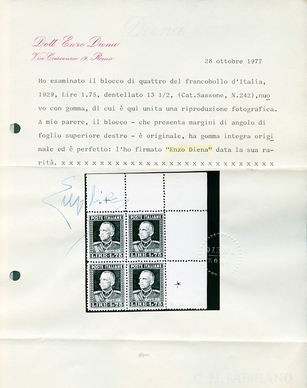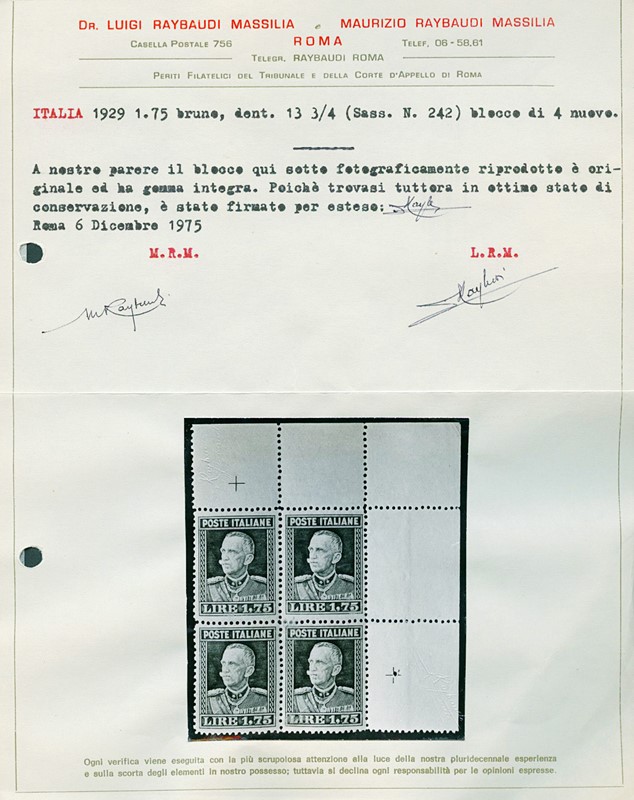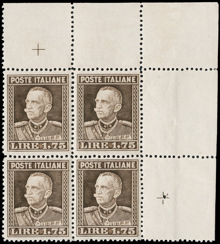 1929 - 1.75L brown, perf. 133/4, block of four with upper right corner margin, MNH, fine/good centring. Signed Giulio Bolaffi and A.Diena, certs. Raybaudi and E.Diena (Sassone 242 – Euro 420,000)